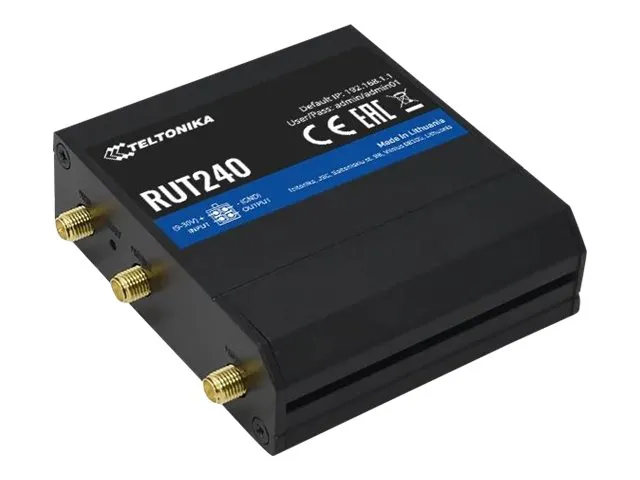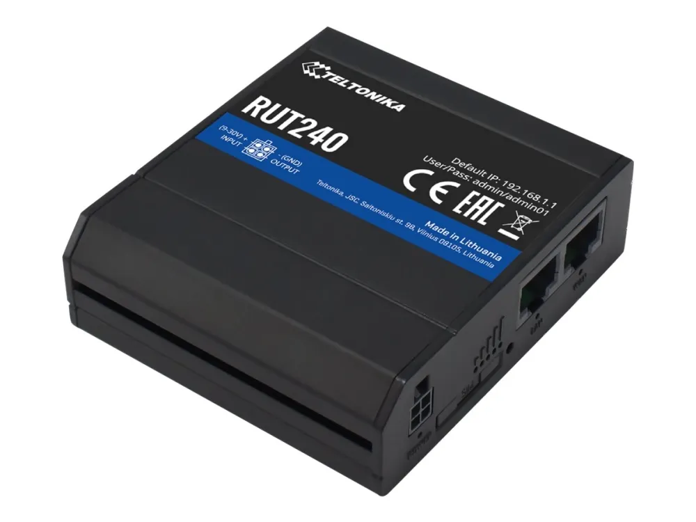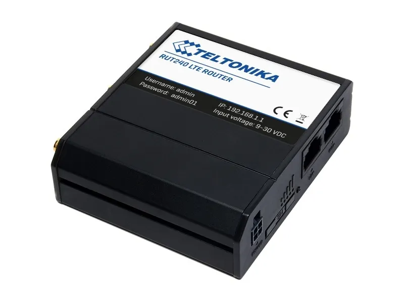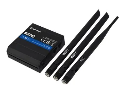 RUT240 is a compact, cost-effective and powerful industrial LTE router for professional applications. Router delivers high performance for mission-critical cellular communication. Equipped with external SIM holder and signal strength status LEDs, it ensures easy network management. External antenna connectors make it possible to attach desired antennas and to easily find the optimal signal location.
