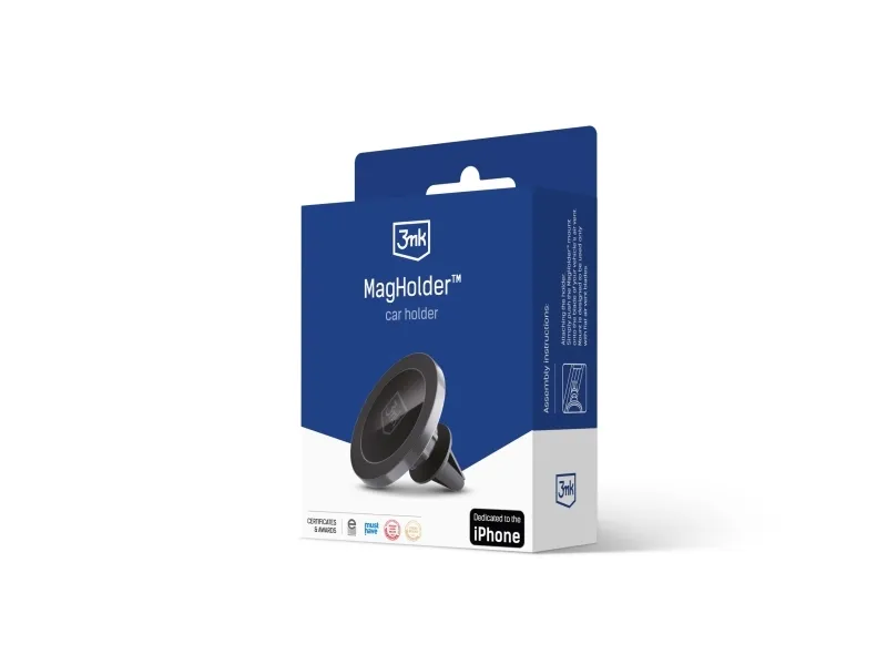 Drive comfortably with the phone securely setThe air vent is the best place to attach a phone holder. The MagHolder™ features a movable and rotating head that connects the holder to the air vent, allowing you to adjust the position of the phone mounted on the holder as needed*. Importantly, this can be done with a single flick of the wrist, guaranteeing safety while driving. Forget about wrestling with the holder while driving!Stabilisation and safetyMagHolder™ is a premium car phone holder dedicated to iPhones. The use of sixteen strong magnets in the holder ensures that your phone is safe, even when braking hard or driving over bumpy roads. The holder is designed to keep the phone in place, even in the most extreme conditions.Damage-free installationThe MagHolder™ has a silicone attachment to the air vent that ensures that no matter how many times you mount and dismount the holder, the air vent will remain intact. With the MagHolder™, you don’t have to worry about any scratches or scuffs on your car. It not only takes care of your phone, but is also safe for your car.Dedicated to iPhonesBy using state-of-the-art technology, the MagHolder™ is compatible with models that support MagSafe technology. However, the good news for iPhones without this technology is that three additional magnetic rings are included for use. Enjoy the best grip, no matter what iPhone model you own!3MK MagHolder. Mobile device type: Mobile phone/Smartphone, Proper use: Car, Product colour: Black