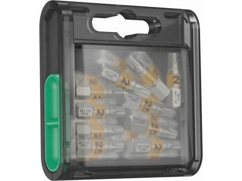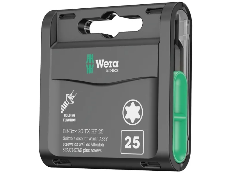 Bit-boks 20 TX TX, TX 20 x 25 mm, 20 dele. Til indvendige TORX® skruer · Med holdefunktion til indre TORX®-skruer · Også passer til Würth ASSY skruer samt Altensloh SPAX T-STAR plus skruer · 1/4 sekskant-drev (Wera tilslutningsserie 1) Med værktøjsfinderen Take it easy: farvemærkning efter størrelser. · I praktisk bit-boks med nem udtagning Førsteklasses bits til indvendige TORX®-skruer i praktisk bit-boks. Med holdefunktion til TORX®-skruer i henhold til specifikationen Acument Intellectual Properties. Passer også til Würth ASSY skruer samt Altensloh SPAX T-STAR plus skruer. 1/4-sekskant, passer til holder i henhold til DIN ISO 1173-D 6,3.