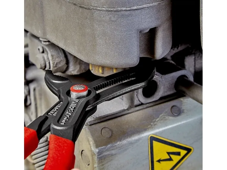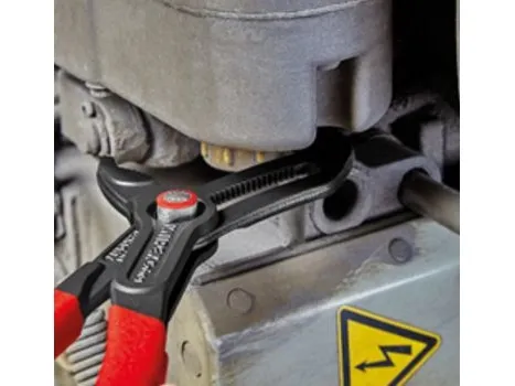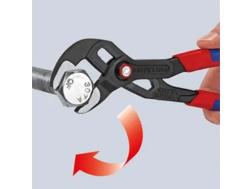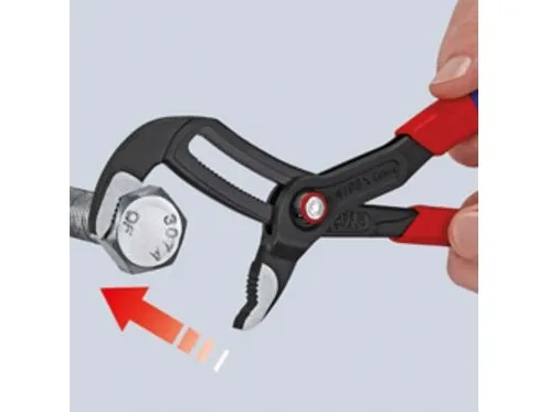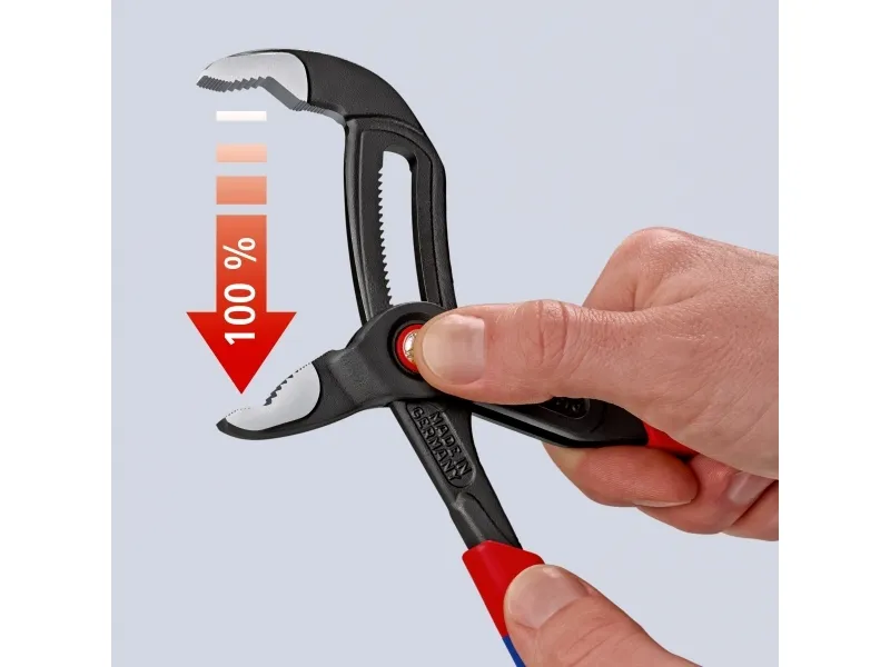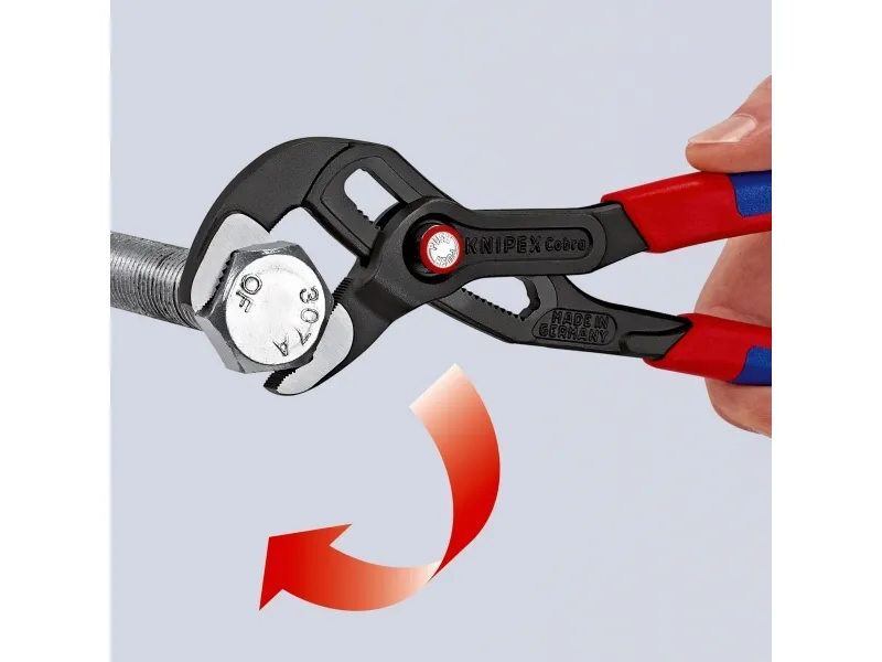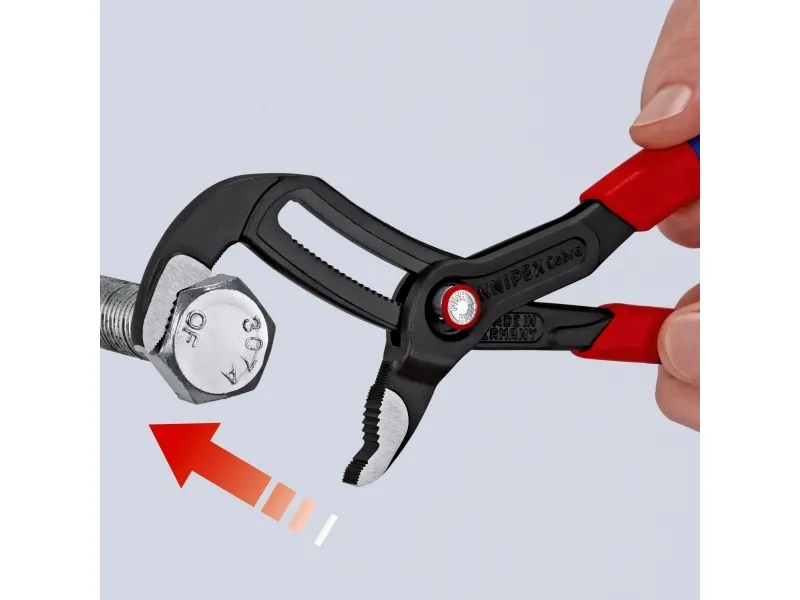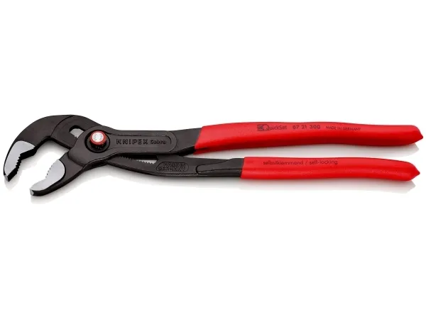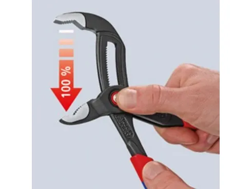87 21 300 KNIPEX Cobra® QuickSet Åbn helt, skub sammen, hold fast!. Ekstra hurtig indstilling på arbejdsemnet ved at skubbe sammen. Forbinder ledboltens kendte, sikre fastlåsning med yderligere skubbefunktion, som gør det nemmere at arbejde på meget trange og utilgængelige arbejdsområder. Indstillingen direkte på arbejdsemnet kan foretages ved ganske enkelt at skubbe sammen. Ledbolten går sikkert i indgreb ved første belastning. Derefter er tangens grebvidde fikseret og kan kun ændres ved at trykke på knappen. For at aktivere skubbefunktionen igen trykkes ledbolten ud ved at trykke på en knap, og tangen åbnes helt igen. Selvspændende på rør og møtrikker: ingen glidning på emnet, energibesparende arbejde. Gribeflader med specialhærdede tænder, tændernes hårdhed ca. 61 HRC: vedvarende sikkert greb pga. høj slidstyrke. Gennemstukket led: høj stabilitet pga. dobbelt føring. Klembeskyttelse forhindrer sammenklemningskvæstelser.