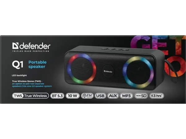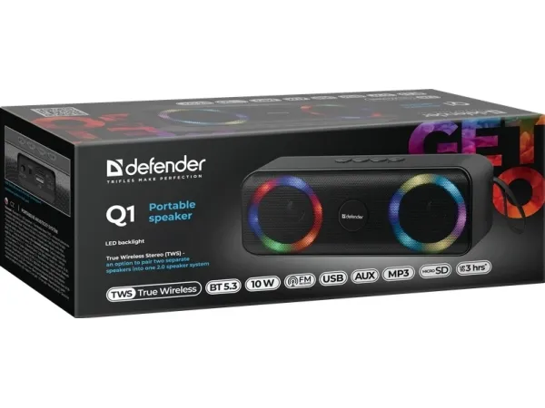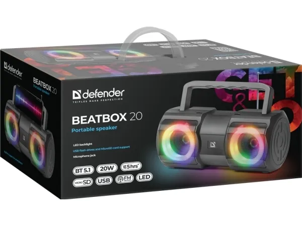 Defender BEATBOX 20. Audio output channels: 2.0 channels, Speaker type: Full range, Driver diameter: 6.35 cm. RMS rated power: 20 W, Frequency range: 85 - 20000 Hz, Impedance: 4 Ω. Connectivity technology: Wired & Wireless, Bluetooth range: 10 m, USB connector type: USB Type-A. Product type: Stereo portable speaker, Product colour: Black, Product design: Cylinder. Recommended usage: Mobile phone / Smartphone, Audio formats supported: MP3, Compatible memory cards: MicroSD (TransFlash)