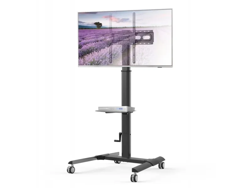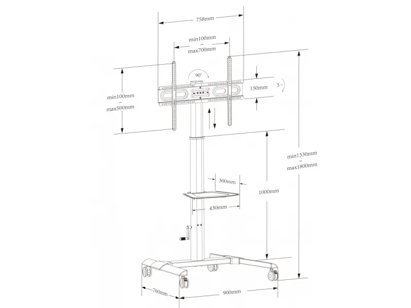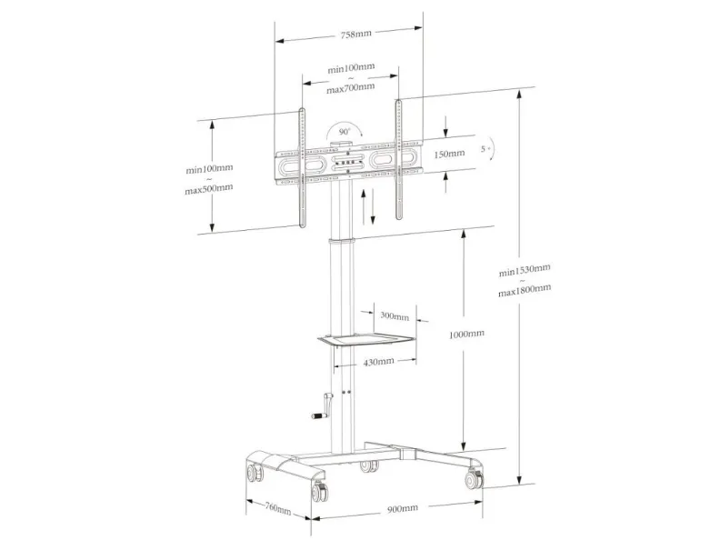 Techly ICA-TR228. Type: Multimedia cart, Product colour: Black, Recommended usage: Flat panel. Height: 1800 mm, Height adjustment: 33 cm, Width: 900 mm. Quantity per pack: 1 pc(s). Warranty period: 2 year(s). Products per master (outer) case: 1 pc(s)
