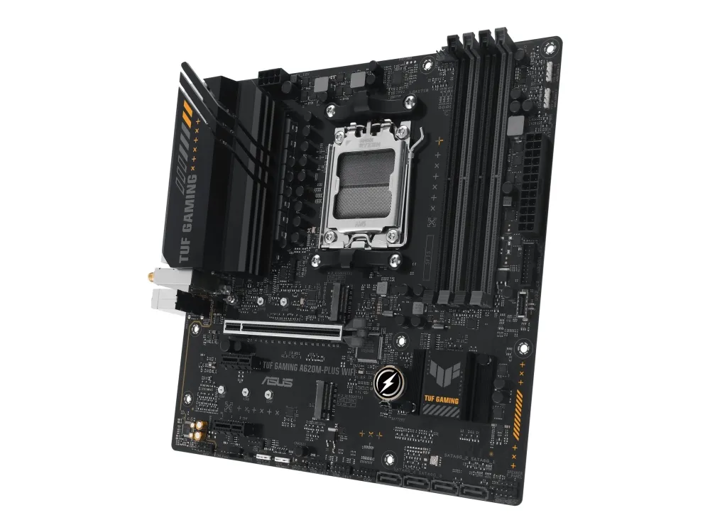 ASUS TUF GAMING A620M-PLUS WIFI takes all the essential elements of AMD Ryzen 7000-series processors and combines them with game-ready features and proven durability. Engineered with military-grade components, an upgraded power solution and a comprehensive cooling system, this motherboard goes beyond expectations with rock-solid and stable performance for marathon gaming. TUF GAMING motherboards also undergo rigorous endurance testing to ensure that they can handle conditions where others may fail. Aesthetically, this model incorporates rugged off-black and geometric design elements to reflect the dependability and stability that defines the TUF GAMING series.