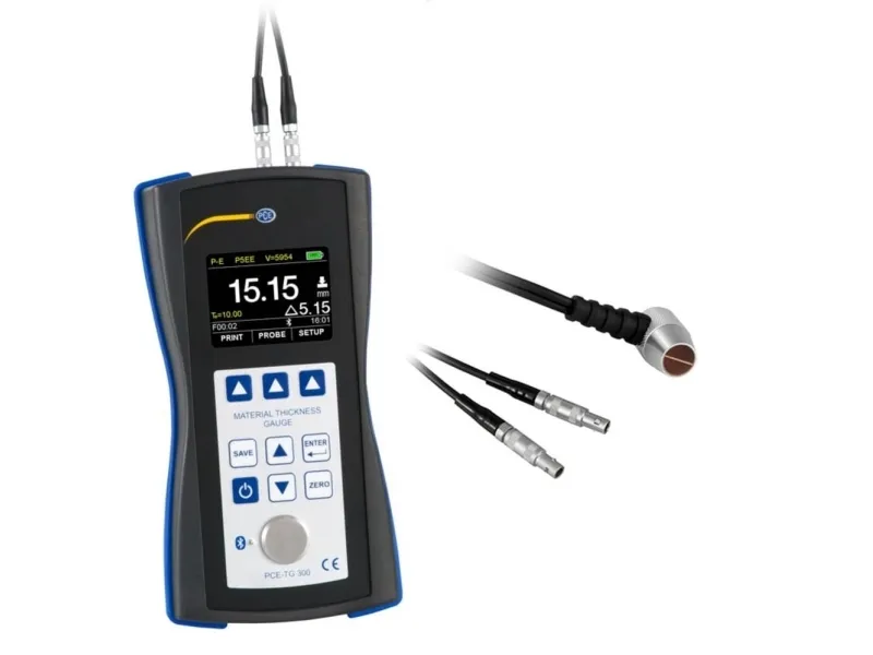 TYKKELSESMÅLER PCE-TG 300-NO5 Måleområde 1... 600 mm (stål)Diameter: 10 mmRørets mindste diameter: 20 x 3 mmFrekvens: 5 MHzBluetoothPCE-TG-NO5 SENSORMåleområde 1... 600 mm (stål)Mindste diameter på rør 20 x 3 mmFrekvens 5 MHzDiameter 10 mmBeskrivelse af normal målingPCE-TG 300-NO5-ENHED Måleområde P-E: Puls-Echo-modus 0,65... 600 mm (stål), E-E: Echo-modus 2,50... 60 mmArbejdsmodi puls-ekko tilstand (fejl- og registrering af fejl), ekko-ECHO-tilstand (visning af lagtykkelser, for eksempel Maling)Kalibrering lydhastighedskalibrering, nulpunktskalibrering, topunkts-kalibreringView modus normal modus, scanningsmodus, differentialmodus Ultralyds ECHO-materialetykkelsesmåler fra PCE Instruments egner sig til måling af vægtykkelse af homogene materialer som metaller, plast, glas eller harpikser ved hjælp af ultralyd i et måleområde på 0,65 … 600 mm. Med en maksimal opløsning på 0,001 mm kan selv meget små forskelle på vægtykkelser måles. For at kunne foretage en præcis måling skal den korrekte lydhastighed for det målte materiale i ultralyd ECHO-ECHO-materialetykkelsesmåler indstilles på forhånd. Med PCE-TG 300-NO5 materialefugtmåler kan lydhastigheden varieres i trin på 1 m/s, derudover er en flerpunktskalibrering også mulig. Hvis materialets lydhastighed ikke er kendt, kan denne også bestemmes ved hjælp af Echo-Echo-materialetykkelsesmåleren. Ved kendskab til emnets tykkelse skal disse indlæses i materialetykkelsesmåleren. Ultralyd Echo Materialetykkelsesmåler PCE-TG 300-NO5 anvendelse 1.når ultralydssensoren er placeret på emnet, vises materialets lydhastighed direkte. Måleværdierne vises på et stort LCD farvedisplay, og det er muligt at navigere via hurtigvalgstaster. Måleværdierne kan gemmes på ECHO-Echo-Echo-vægtykkelsesapparatets interne hukommelse. Til analyse kan disse data enten analyseres med den valgfrit tilgængelige PC-software eller udskrives direkte via Bluetooth med en printer. Echo-Echo-vægtykkelsesmålerens funktionalitet udvides via valgfrit tilgængelige sonder. Sonder med 2,5 MHz, 5 MHz og 7 MHz og forskellige diametre er tilgængelige, og ud over homogene standardmaterialer kan man således måle både stærkt dæmpende materialer som støbejern eller plast og tynde komponenter.Måleprincip ultralyd materialetykkelsesmålingDen menneskelige hørelse kan registrere lydfrekvenser på op til 16 kHz, frekvenser over denne grænse kan ikke høres af mennesker og betegnes som ultralyd. Denne ultralyd anvendes i industrien inden for forskellige områder som for eksempel ved svejsning, ved rengøring, ved ikke-destruktiv fejlprøvning (NDT) eller ved måling af materiale. Ultralyd absorberes, reflekteres, spredes eller transoptages alt efter materialet. Ultralyd Echo Materialetykkelsesmåler PCE-TG 300-NO5 anvendelse 1.Materialetykkelsesmålingen ved hjælp af ultralyd egner sig især til alle lydledende materialer med homogen struktur, hvor der kun optræder få strøs- og reflektionseffekter. Metalliske materialer som stål er ideal for eksempel, da mikrostrukturen inden for materialet ultralydbølger meget nemt leder, hvorved høj indtrængningsdybde og klare reflektionsmos dannes på grnflader.De vigtigste parametre i forhold til materialet er lydhastigheden og lydudsvagningen. Ved lyddæmpning skelnes der mellem lydabsorption og støjspredning. Lydabsorptionen opnås ved at omdanne lydenergien til andre energiformer, f.eks. Varme. På denne måde reduceres styrken af det nettorignal, der opnås ved måling af materialetykkelsen, med kortere levetid i materialet. Da absorbansen afhænger af prøvningshovedets frekvens, kan absorbansen mindskes, f.eks. ved at testsekvensen reduceres, hvorved der er mulighed for højere indtrængningsdybder. Lyddæmpningen skyldes strømvirkningen ved elementets korngrænser. Også her øges lydspredningen ved at øge testsekvensen, og den er endda uforholdsmæssigt stor i forhold til absorbansen. Ved måling af materialetykkelser af stærkt lydsvagere materialer som f.eks. plast eller støbejern kan man til dels opnå bedre resultater ved at nedsætte testsekvensen.Ved måling af materialetykkelser med ultralyd bliver impedans eller lydabsorption og lydhastigheder fra forskellige materialer udnyttet. Jo større forskellene i impedans eller også akustiske modstande mellem tilstødende materialer er, desto klarere kan der findes refleksioner af ultralyd. Luft har f.eks. en stærkt dæmpende egenskab i forhold til ultralyd, så der opstår stærke reflekser ved grænseflader mellem metaller og luft. Denne effekt anvendes ved måling af materialetykkelser til at registrere vægtykkelser. Samtidig sørger denne effekt også for, at der skal påføres koblingsgelen mellem sonde og emne for at bygge bro over luftspalten, som uden kontrakt mellem koblingsgl ville forhindre transmission af ultralyd fra sonden til arbejdsemnet.Ultralyds Echo-Echo måling af materialetykkelserVed ultralyd ECHO-ECHO-materialetykkelsesmåling analyseres flere ekko. Denne metode til måling af materialetykkelser egner sig især til belagte emner. Hvis ultralydssensoren placeres på det overfladebehandlede emne, bliver belægningen med henblik på pulsekECHO-måling indberegnet til materialetykkelse. Der opstår en fejl som følge af forskelle i lydhastigheder mellem overfladebehandlingsmateriale og grundmateriale. For et plastbeklædt stålværk varierer lydhastigheden mellem 3000 … 4000 m/s. Hvis lydhastigheden i måleinstrumentet indstilles til stål, måles overbelægningen med en forkert lydhastighed ved måling af den samlede materialestyrke, was der fejlagtigt resultat. Desuden er det ved måling af materialetykkelsen for det meste ikke målet at måle tykkelsen af en belægning - til dette formål anvender man måling af lagtykkelser, men bærematerialets tykkelse. Ved hjælp af ultralydstykkelsesapparatets ECHO-funktion fratrækkes coatingstyrken i den samlede materialetykkelse. Således kan ultralyd ECHO-ECH