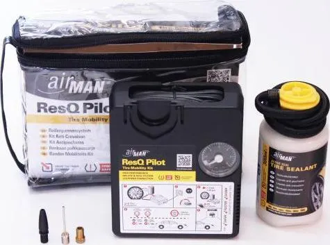 Dæk-panelsæt ResQ Pilot Valve Through Sealant 300 12 V kompressor med cigarettænderstik · effekt 12 V, 10 A, 120 W · 2.6 m kabel kan gemmes i kabinettet · integreret trykmanometer (bar/psi) · maks. tryk: 6,2 bar · maksimal effekt: 36 liter ved 2,5 bar · stabil transporttaske · 300 ml dæktætningsmiddel og systemfastgørelse · vandopløselig · ikke brændbar · forårsager ingen rust · miljøvenlig · let at rengøre · egnet til dæktrykskontrolsystemer (RDKS eller TPMS) Bestående af kraftig kompressor i kompakt konstruktion, airman-dæktætningsmiddel (300 ml i partikel-gelteknologi) og transporttaske. ideal til køretøjer i kompakt- eller minibilklassen og anhænger.