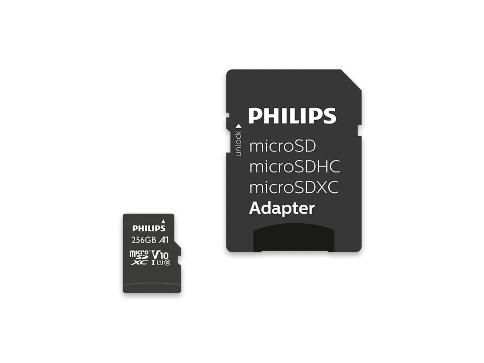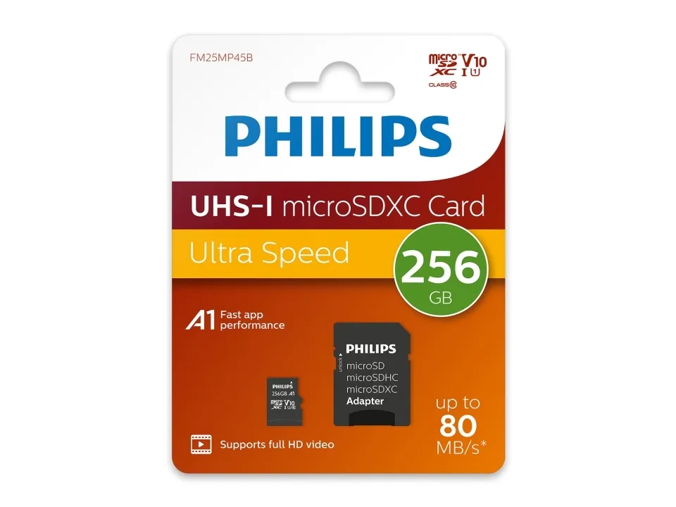 Spacious Storage Capacity: Available in various storage capacities, including 16GB, 32GB, 64GB, and more, the Philips Micro SDHC/XC memory card provides ample space to securely store all your memories and data. From photos and videos to apps, games, and music, you can rely on this memory card to store all your digital content without worrying about running out of space.Philips FM25MP45B/00. Capacity: 256 GB, Flash card type: MicroSDHC, Flash memory class: Class 10, Internal memory type: UHS-I, Read speed: 80 MB/s, Write speed: 30 MB/s, UHS Speed Class: Class 1 (U1), Video Speed Class: V10. Product colour: Black