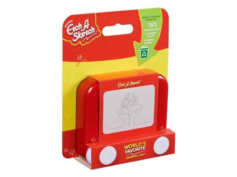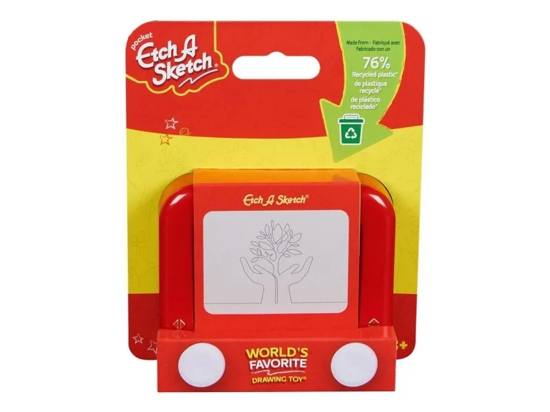 Together, we’re etching our way to a better tomorrow with the Etch A Sketch Pocket, original magic screen drawing toy for boys and girls ages 3+! Now made with 76% recycled plastic, this environmentally conscious classic toy has delighted and inspired creativity for over 60 years. Express yourself through drawing and design! The iconic Etch A Sketch red frame, easy-to-use knobs, and classic magic screen are now available in a fun, pocket-sized version for on-the-go entertainment. The magic screen captivates children of all ages, allowing them to draw, create, and erase simply by shaking the toy – perfect for endless creativity and fun. No batteries, charging, or cords are needed! the Etch A Sketch Pocket toy is powered entirely by your child's imagination. Whether you're on a road trip, a flight, or just need a screen-free activity, the Etch A Sketch Pocket is the perfect sketch pad travel toy for young artists and adventurers. Inspire your child's creativity and keep them entertained for hours with this compact, sustainable drawing toy!
