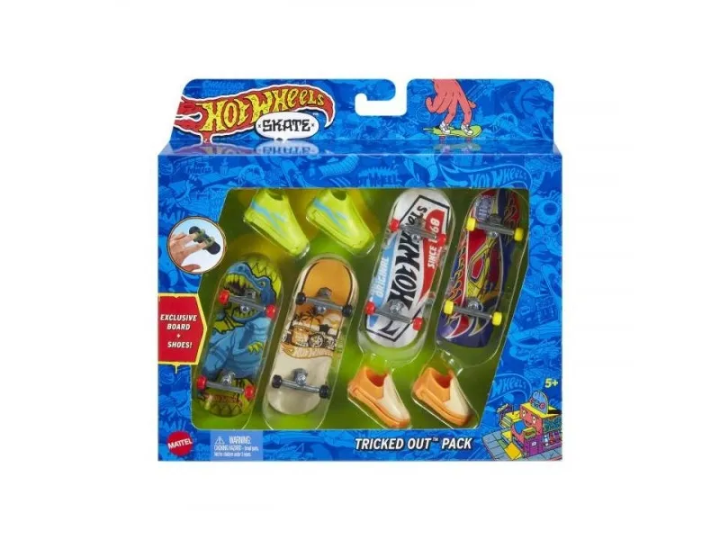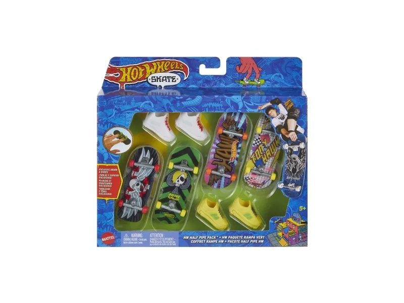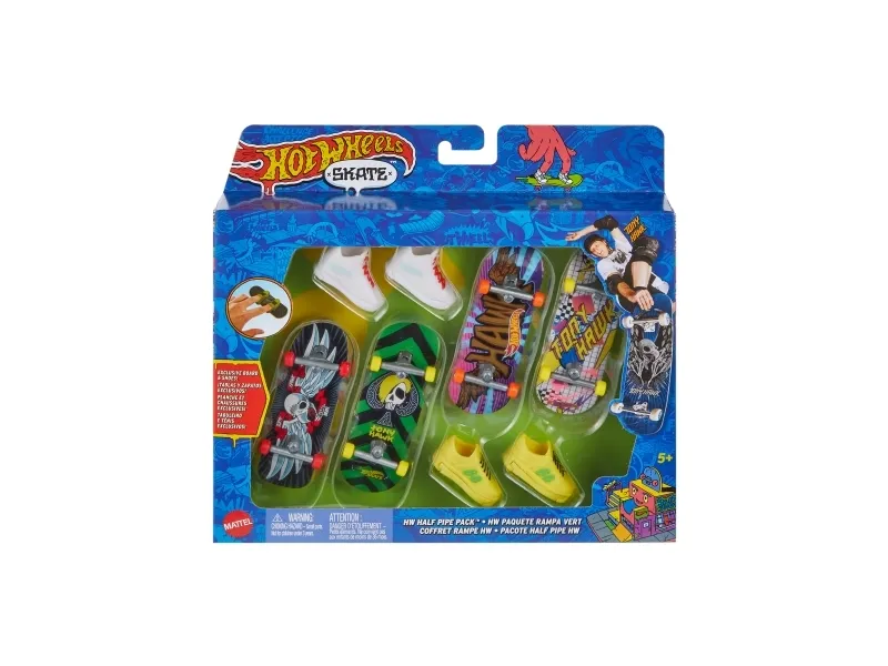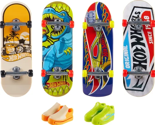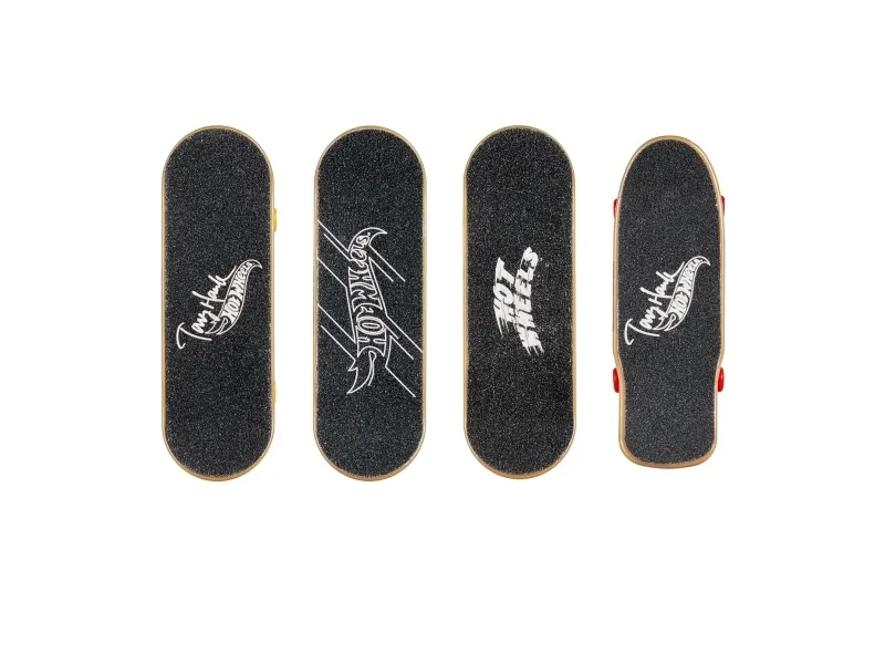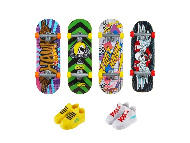 Perform gnarly stunts and master elite moves with this multipack of Hot Wheels Skate™ fingerboards and skate shoes. Hot Wheels® collaborated with skateboarding legend Tony Hawk to design the sweetest boards that look cool grinding rails and launching ollies. The set includes four different, awesomely styled and fully assembled fingerboards along with two different pairs of shoes that can be used interchangeably with all boards. The shoes help kids get the feel of the board and its movements as they master stunts and flips. Each multipack includes one exclusive fingerboard and pair of skate shoes. Colors and decorations may vary.