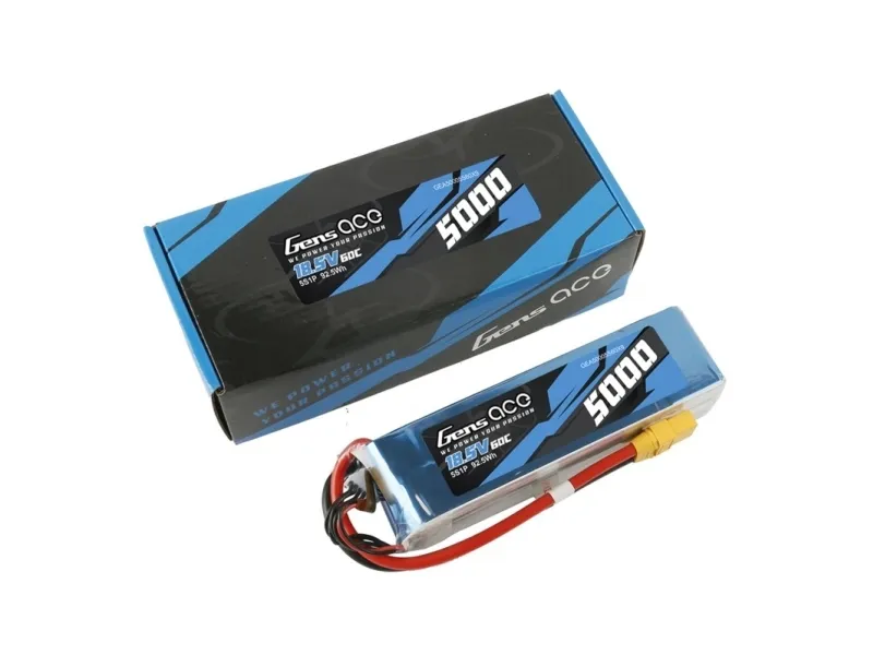 Gens ace lipo 5000mAh 5S1P 60C lipo battery pack has remarkable stacking technology which enables single cell capacities of 5000mAh. With high discharge performance and high energy density.Gens ace batteries provide high quality, reliable power, this battery fits for 700 size heli, scale soaring.Gens ace GEA50005S60X9. Product type: Battery, Product colour: Blue, White