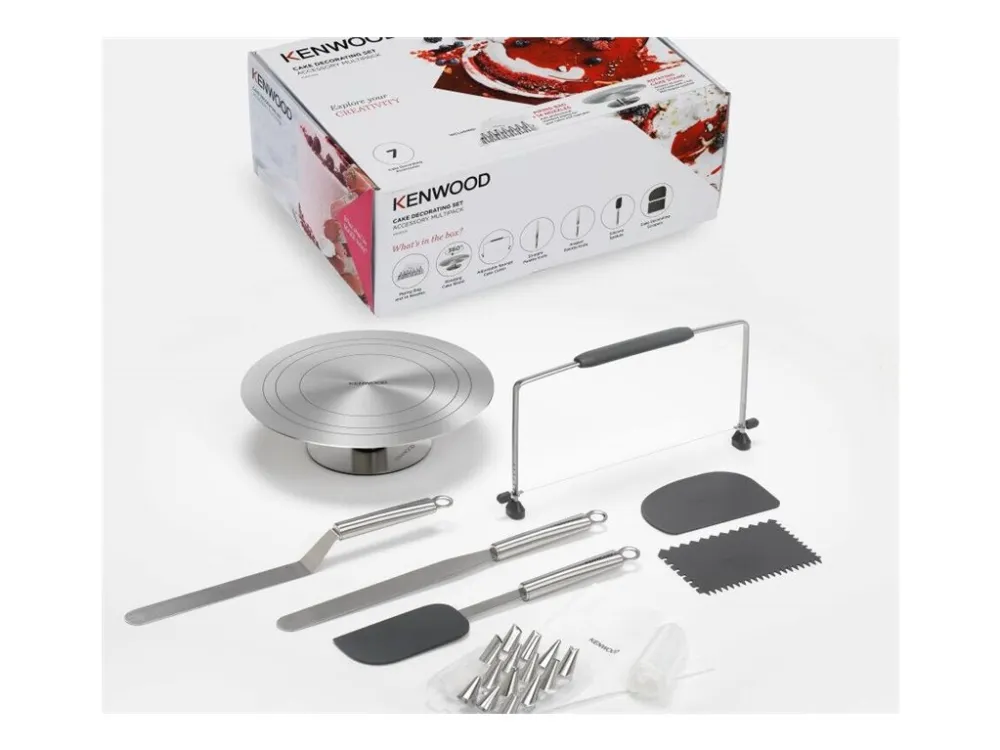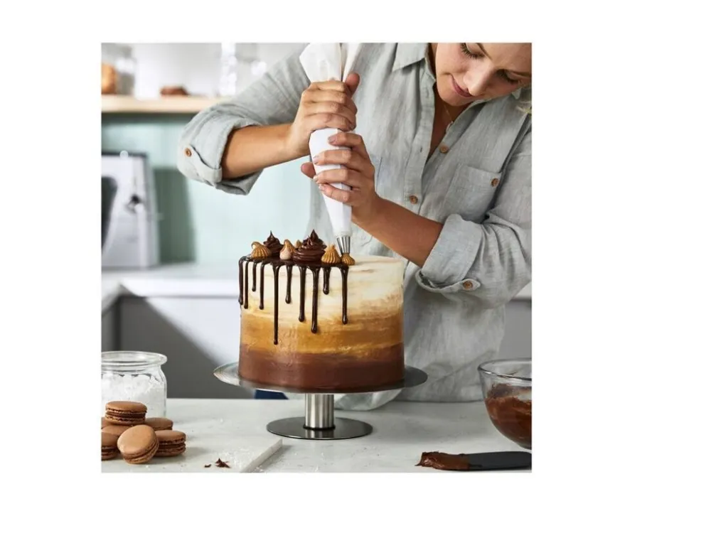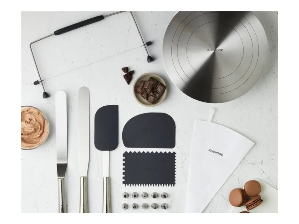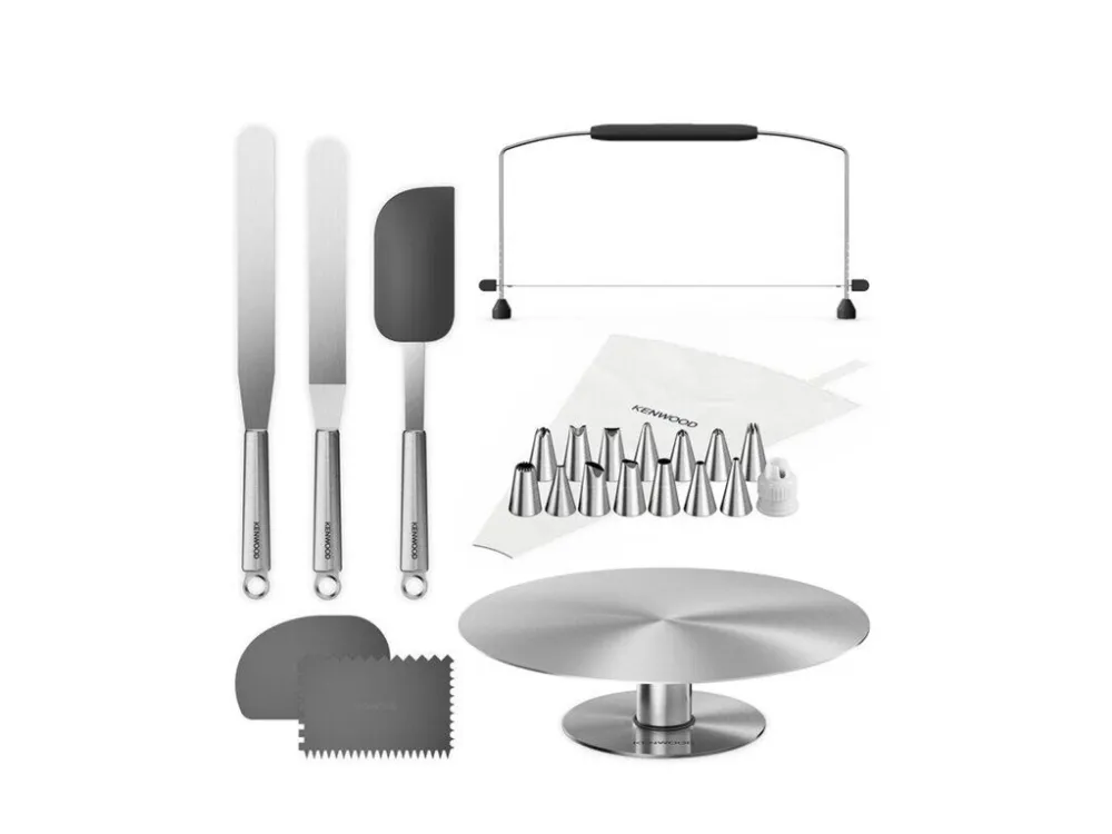 Add the finishing touches to your favorite bakes with this complete professional quality decorating set. Comprising of two premium stainless steel palette knives, stainless steel and silicone spatula, icing scrapers, piping bag with 14 nozzles, sponge cake cutter, and a stainless steel rotating cake stand, you'll have all the tools you need to help add the wow factor to all of your creations.