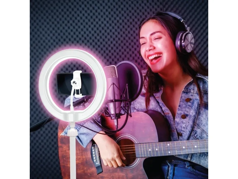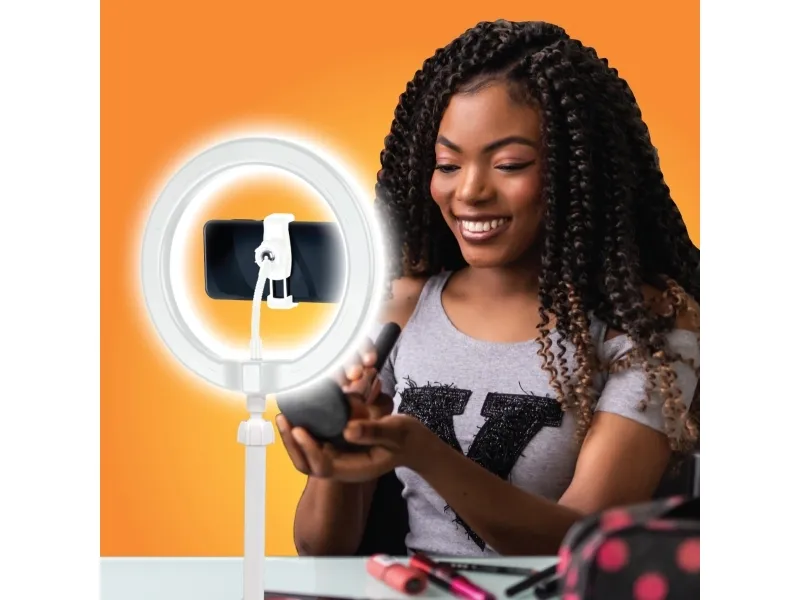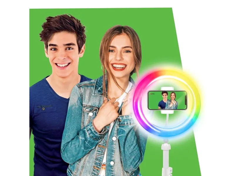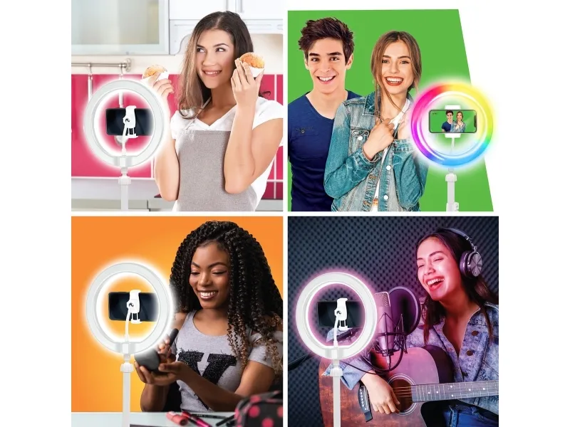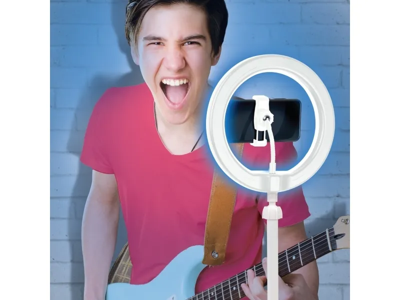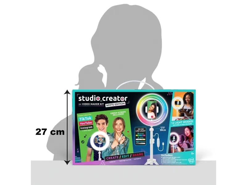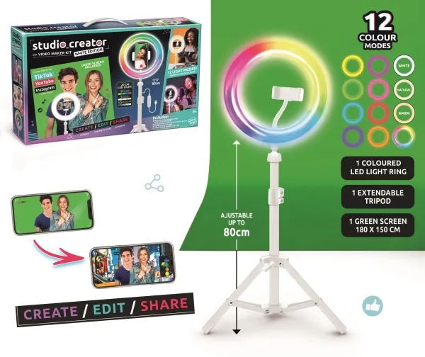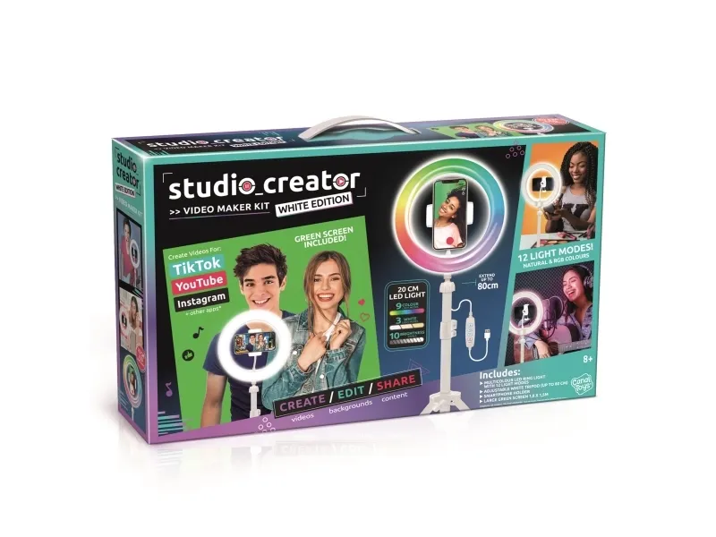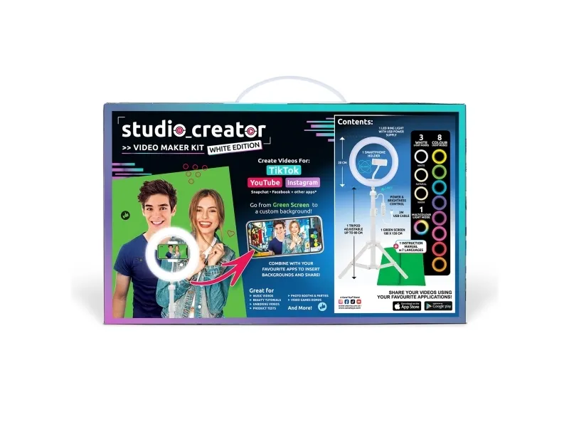 Lag fantastiske videoer som du kan dele på nettet. Lag fantastiske videoer som en proff med dette Studio Creator Maker-settet! Vakkert lys og spesialdesignede bakgrunner tar videoene dine til neste nivå. Gå fra grønn skjerm til bakgrunner du selv velger. Still inn det ideelle lyset og ta opp deg selv foran den grønne skjermen. Deretter kan du, ved å bruke favorittappene dine, sette inn spesielle bakgrunner. Det er uendelige muligheter for å uttrykke humøret, interessene og kreativiteten din gjennom video! Enten du vil lage videoer for å dele online eller privat med bare familie og venner, kan Studio Creator Video Maker-settet hjelpe deg med å se fantastisk ut! Fra 8 år. Inkluderer: - LED-ringlampe 20 cm med USB-strømforsyning og 12 lysinnstillinger - smarttelefonholder - grønn skjerm 1,8 x 1,5 m - stativ, kan justeres opp til 80 cm i høyden