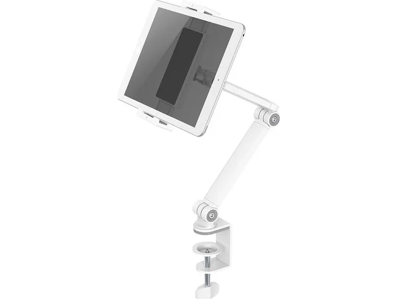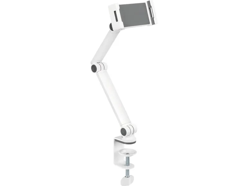 The Neomounts DS15-545WH1 is a universal tablet mount for tablets from 4.7" up to 12.9" with a weight capacity of 1kg. The tablet mount has 3 pivoting points and is ideal for hands-free video calling, watching a movie, playing a game or to use a tablet as a second screen. The integrated ball joint allows the mount to rotate 360° so you can switch between portrait and landscape position. Additionally, the clever tilt (270°) and swivel (104°) options allow the stand to further change to the ideal viewing angle. Soft rubber pads protect your device from any scratches and the solid base with anti-skid silicon pads ensure solid positioning of your device.
