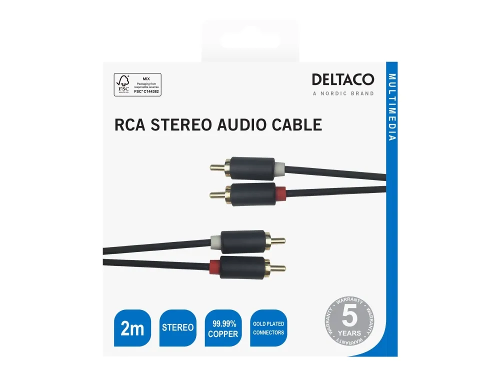 Deltaco DELTACO lydkabel er designet for å gi lydutgang med sin stereolydfunksjon. Kabelen er laget av 99,99 % kobber, noe som sikrer minimalt signaltap for en klar lydopplevelse. De gullbelagte kontaktene forbedrer ledningsevnen og gir holdbarhet, noe som gjør den egnet for bruk i hjemmekinoanlegg. Med hann-RCA-kontakter i begge ender er den enkel å koble til forskjellige lydenheter, noe som sikrer en pålitelig oppsett for dine lydbehov.