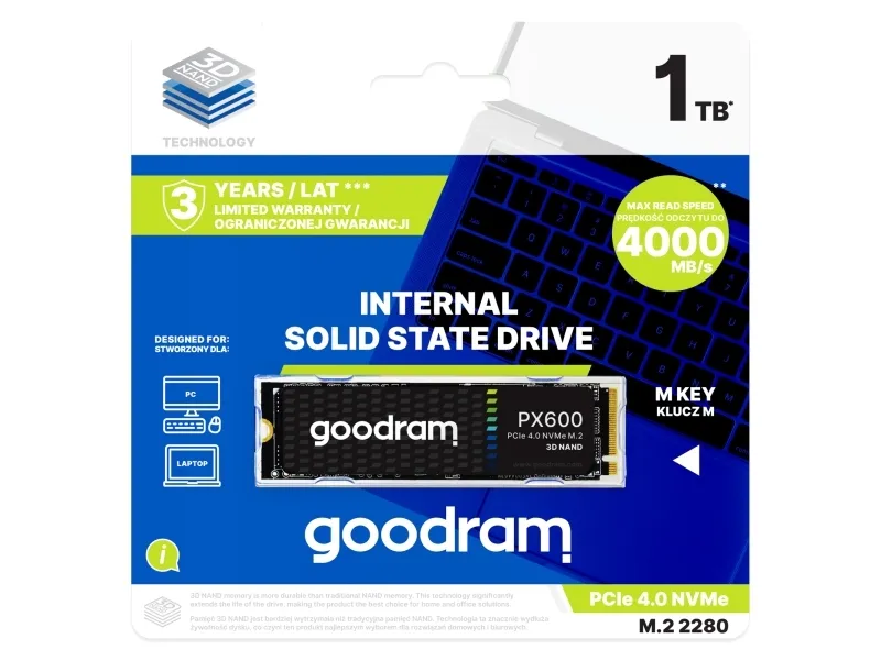 The Goodram PX600 SSD is a solution for demanding users who are looking for reliable memory with fast data transfer. Thanks to the PCIe 4 x4 standard, the drive operates at speeds of up to 5000 MB/s. The parameters of the PX600 will be appreciated by computer graphic designers, gamers, people operating photo and video editing programs and also those working on large data sets. This drive is also an ideal solution for users looking to improve the performance of their PC or laptop. The SSD's blazing speed means smooth operation, system responsiveness, fast loading of games and applications, and comfortable task performance. The drive offers up to 10x better sequential and random transfer performance compared to SSDs with older interfaces.