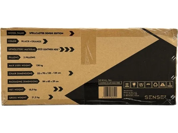 Modellnavn: Spellcaster SENSHI Dimensjoner: Høyde: 125-134 cm Bredde: 70 cm Dybde: 55 cm Vekt: 19 kg Maksimal belastning: 150 kg Anbefalt brukerlengde: opptil 185 cm Polstring: HDE™ økologisk skinn Farge: svart Fyll: Rygg - pustende elastisk HR-skum Sete - kaldt skum EasyFoam™
