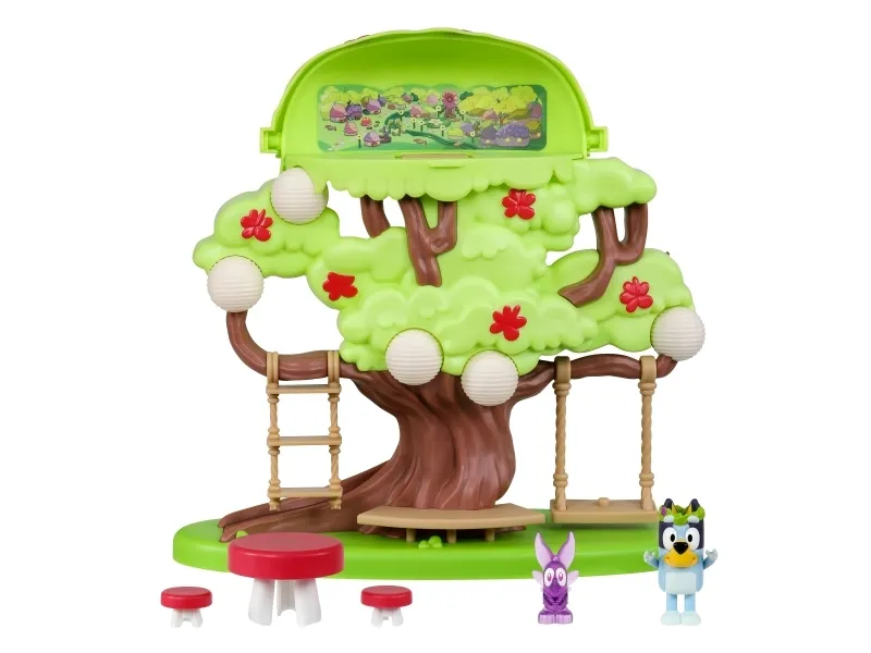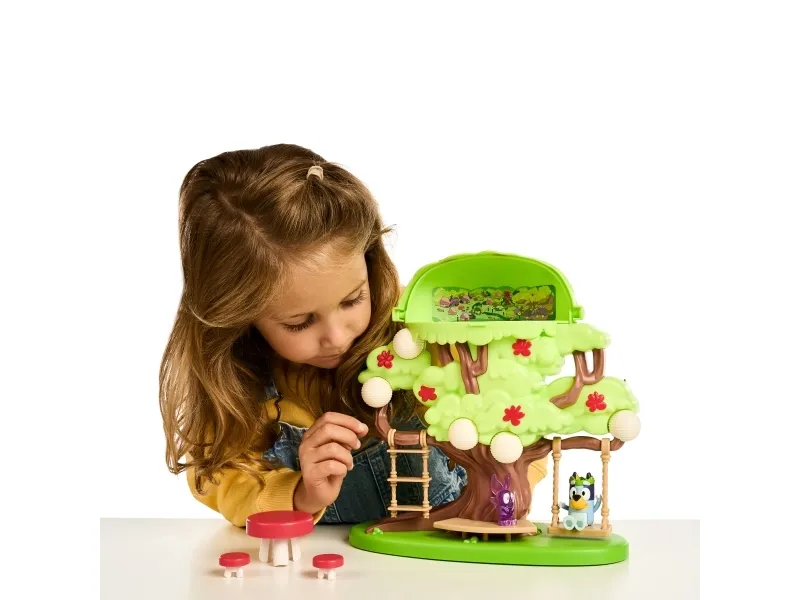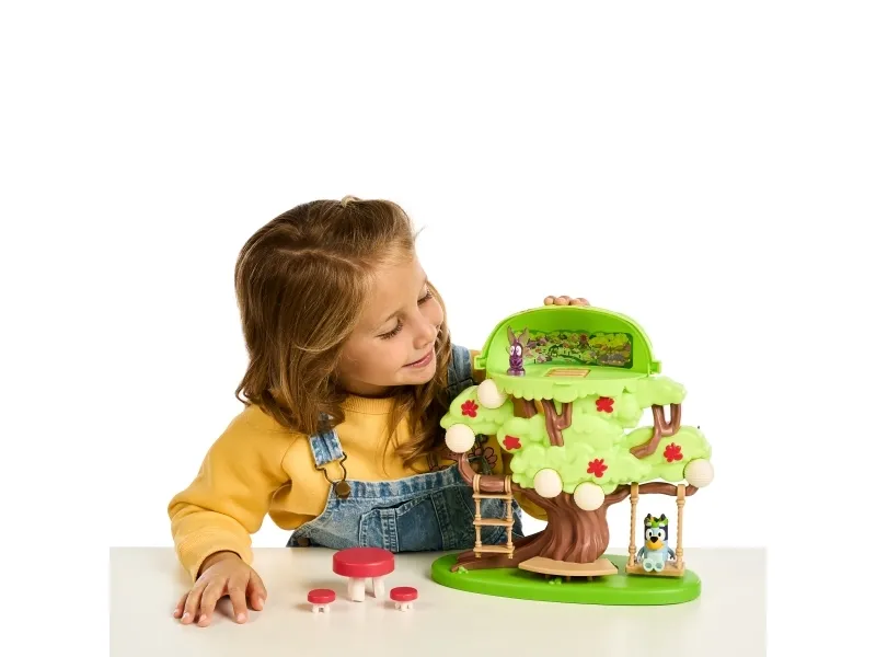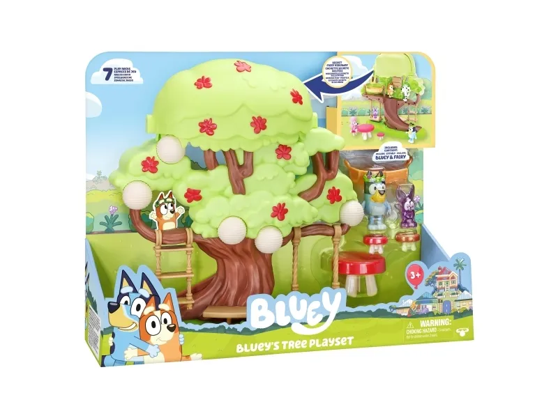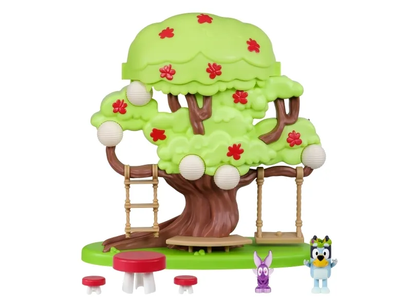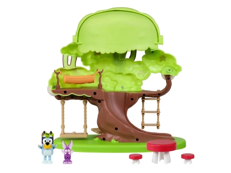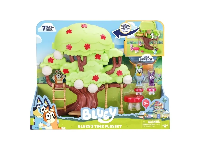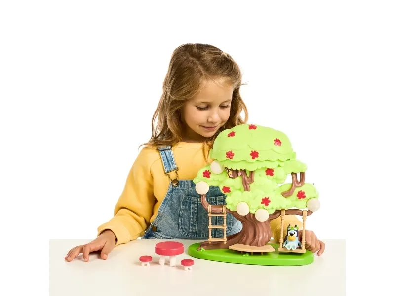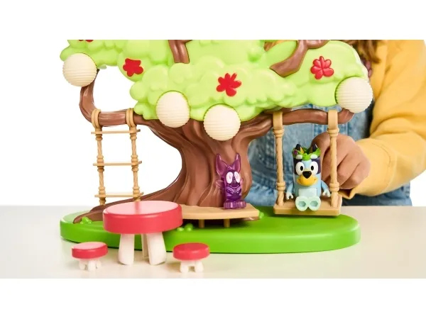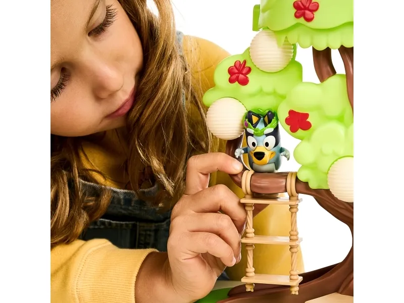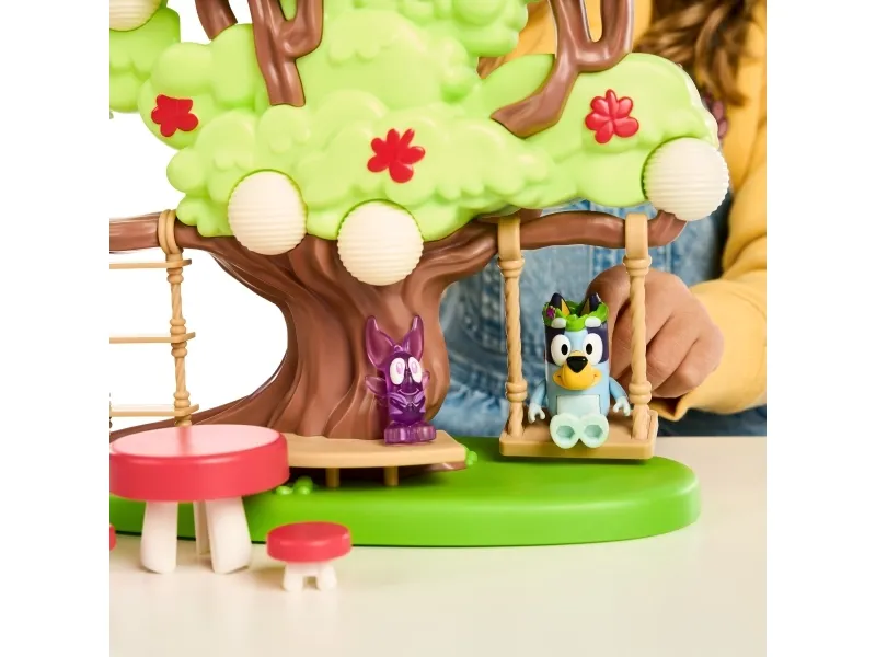 Hun kan både klatre op ad stigen, gynge på gyngen eller tage rutchebanen ned fra træet for at lege ved bord & stolesættet. Når Bluey har leget i timevis i træet, kan hun tage en afslapper i hængekøjen eller ledee efter den hemmelige dør til feen.