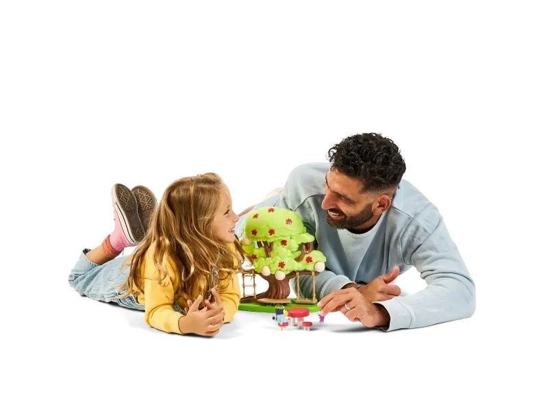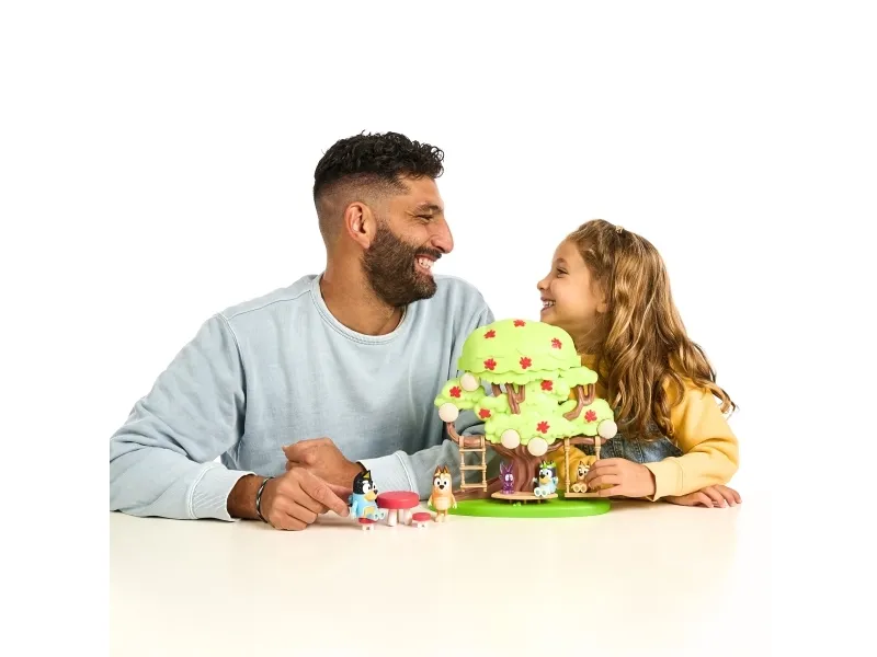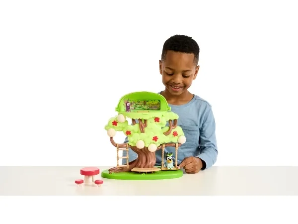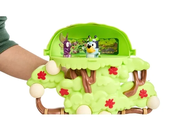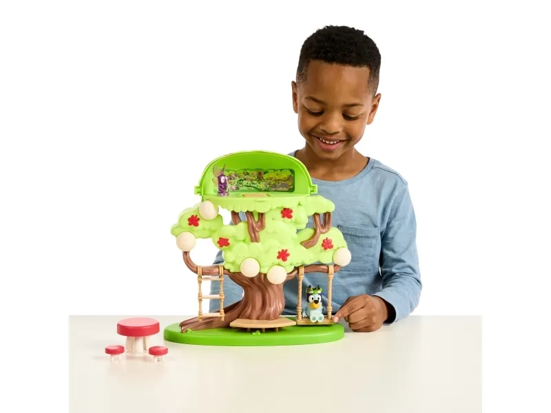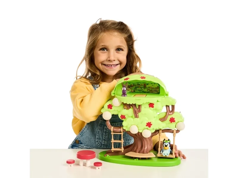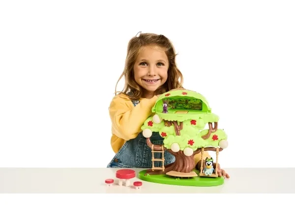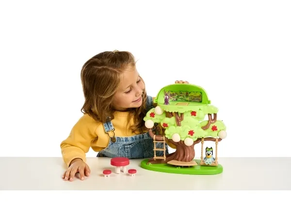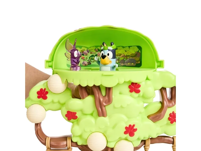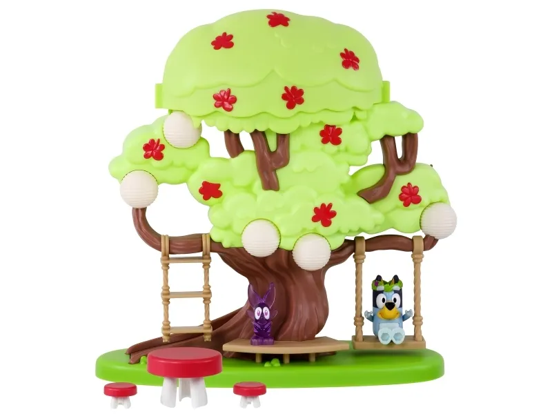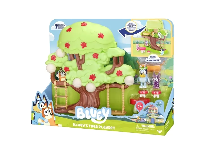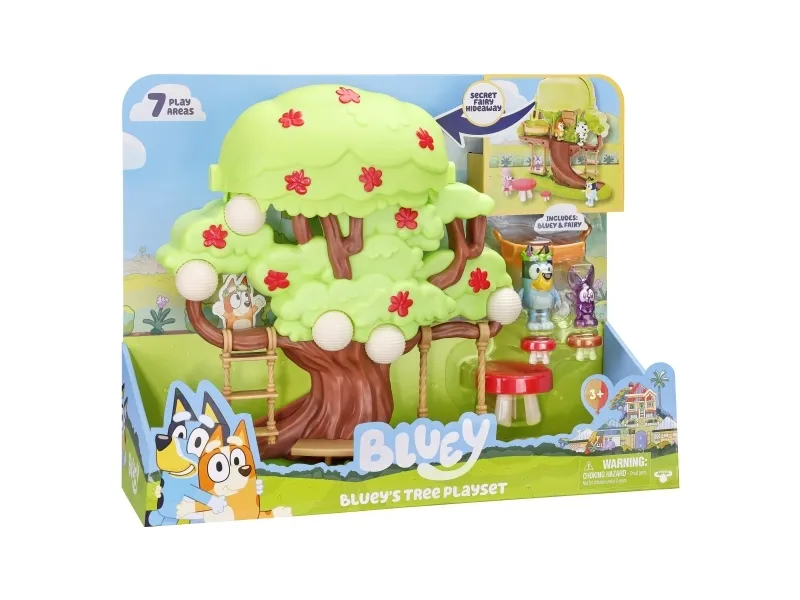 Hun kan både klatre op ad stigen, gynge på gyngen eller tage rutchebanen ned fra træet for at lege ved bord & stolesættet. Når Bluey har leget i timevis i træet, kan hun tage en afslapper i hængekøjen eller ledee efter den hemmelige dør til feen.