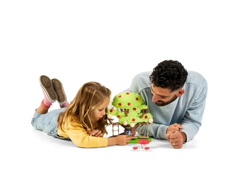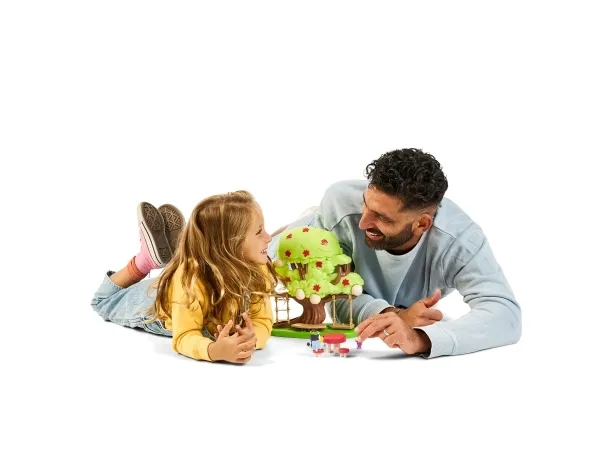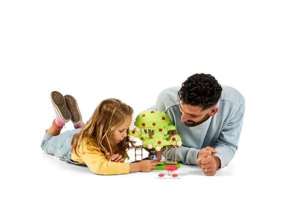 Funktioner: Dekorer træhuset med klistermærker Frontbaldakinen kan åbnes op for at afsløre feens hemmelige gemmested Den hemmelige dør på taget giver adgang til gemmestedet Glid på rutchebane Gyng på gyngen Klatre på stigen Ta’ en slapper i køjen