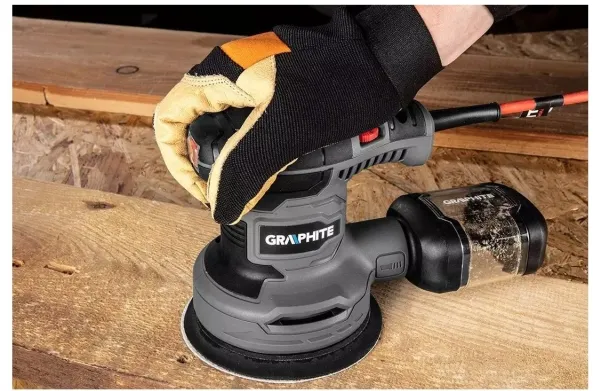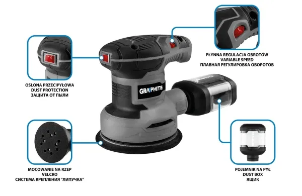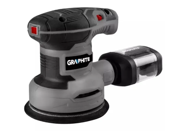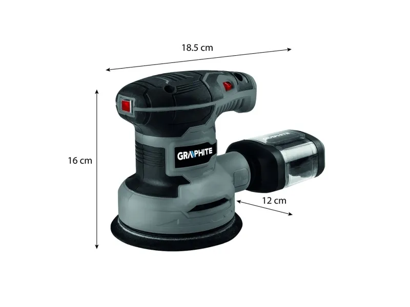 The eccentric sander 300 W, 125 mm foot 59G348 by GRAPHITE is a machine with a 125 mm foot and 300 W of power. It reaches speeds of 7,000 to 13,000 revolutions per minute and the amplitude of oscillation is 1 mm. The sander has a built-in dust extraction system to keep the workplace tidy. Speed settings (1-6) allow greater control over the machine. The non-slip handle and weight of 1.21 kg allow one-handed operation. The kit comes with 3 pieces of 125mm, Velcro-fastened sandpaper and a container. The GRAPHITE eccentric sander will be indispensable in the workshop when sanding and smoothing surfaces.Graphite 59G348. Quantity per pack: 1 pc(s). Depth: 150 mm, Weight: 1.33 kg