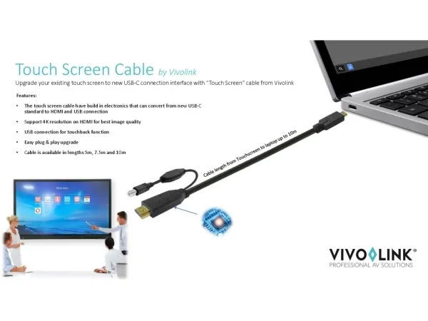 The VivoLink Touchscreen cable is a versatile and high-performance solution designed to meet the connectivity needs of modern devices. With features like a 5 Gbps data rate, Power Delivery (PD) technology, and Ultra HD (4K) support, it ensures that data transfers, device charging, and video output are efficient and of high quality. The cable's 7.5 m length provides ample reach, making it ideal for various setups, from home entertainment systems to professional workstations. Additionally, its Plug-and-Play compliance simplifies installation, eliminating the need for complex setup procedures. Whether for personal or professional use, the VivoLink Touchscreen cable is a reliable choice for enhancing your connectivity experience.