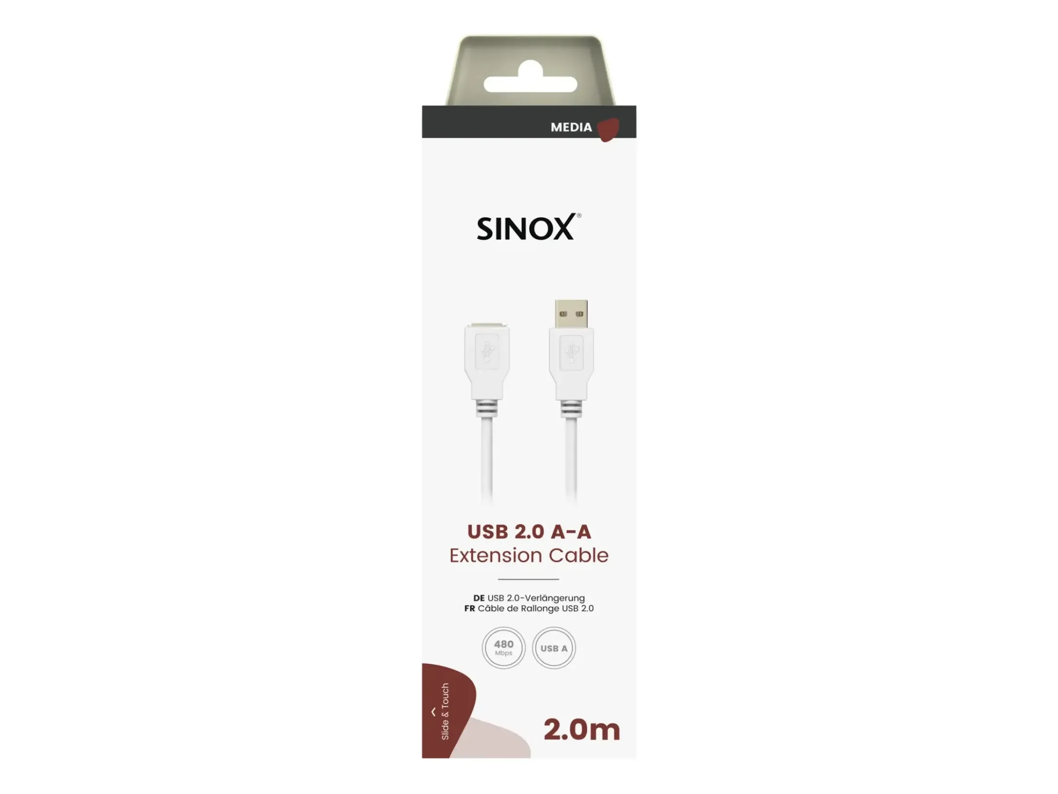 Sinox USB 2.0 forlængerkabel. 2m. Hvid. USB A (han) - USB A (hun) Version 2.0 High speed 480 Mbit/S Pakket i FSC papæske Sinox USB 2.0 forlængerkabel bruges til at forlænge eksisterende USB kabel.