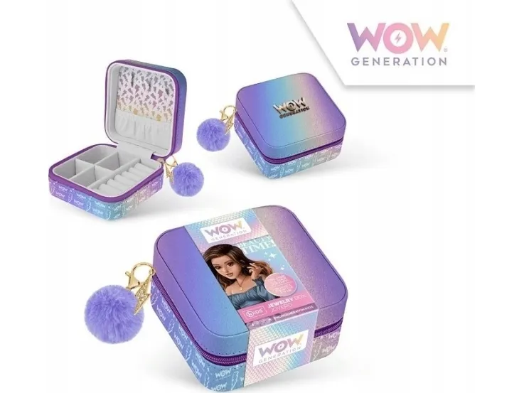 Smykkeæsken, der er lavet af PU-læder, har flere rum, herunder ringruller, et rum til armbånd, øreringe og halskæder og en lomme med elastikbånd. Den har lynlåslukning og pompon med en WOW Generation glittercharme som dekorativt element. Det metalliske effektdesign er også trendy. Gå ikke glip af WOW-glamouren med dette rejse smykkeskrin