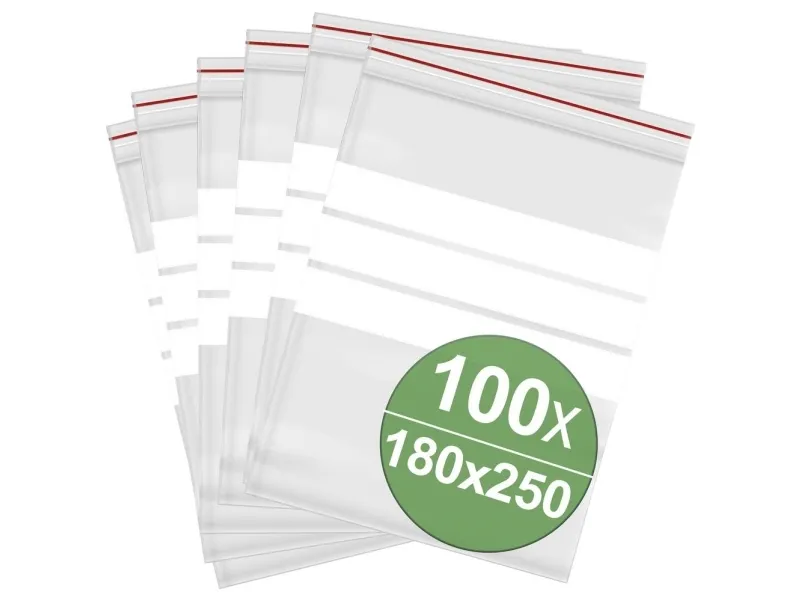 Tryklukningspose m. Striber 180 x 250 mm 100 stk. Tryklukningspose er i dag uundværlige produkter og anvendes til en lang række anvendelser! Ved hjælp af zip-mekanismen på posens åbning (markeret med en rød streg) kan posen åbnes og lukkes helt stille og slides frit. Standard-materialetykkelse på 50 µm er den optimale tykkelse til næsten alle applikationer og en allround-enhed, hvad angår stabilitet, gennemsigtighed og fleksibilitet. Plastkøserne beskytter smådele pålideligt mod ydre påvirkninger, snavs og støv. Ved hjælp af den røde streg kan den åbne side hurtigt bestemmes. Varianterne er forskellige i størrelse og en helt gennemsigtig version eller med markeringsstriber. Ikke egnet til børn!
