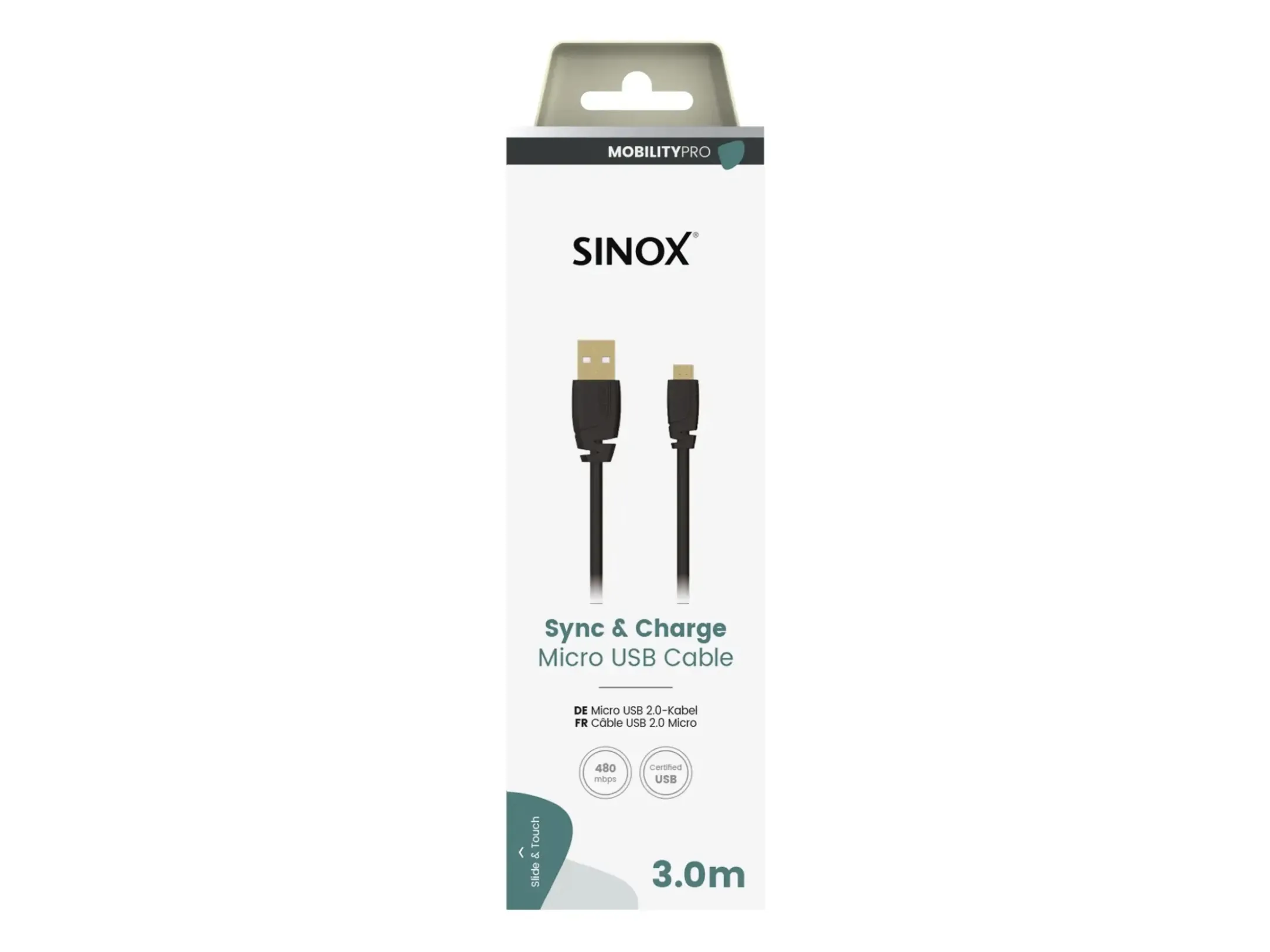 Sinox Micro USB kabel. 3m. Sort. Micro USB (han) - USB A 2.0 (han) Virker til de fleste Android® telefoner 24K guldbelagte stik Opladning og synkronisering Pakket i FSC papæske Sinox Micro USB kabel til at oplade og synkronisere din Android® mobiltelefon.