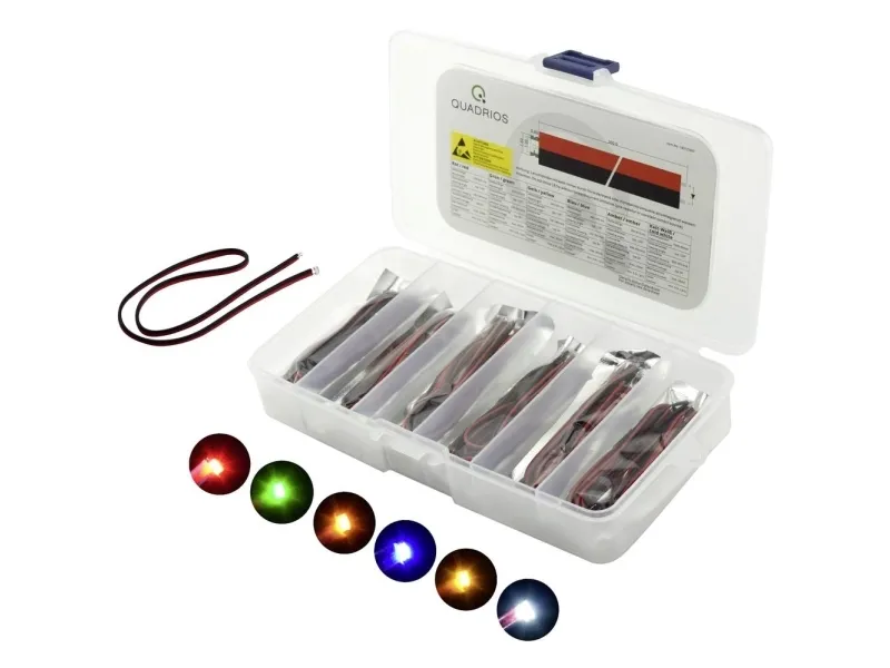 SMD-LED konstruktion 0603 med 30 cm tråde 30 dele Dette SMD-LED-sortiment med meget lysstærke, overflademonterede lysdioder i størrelse 0603 har et stort udvalg af farver og er sorteret overskueligt. Da disse lysdioder med ca. 1,6 x 0,8 x 0,4 mm er meget små, kan den enkelte, manuelle videreforarbejdning blive vanskelig – mekaniske skader eller varmeetod er ofte bivirkninger. Derfor er små tråde med en længde på 30 cm i forvejen professionelt anbragt på anode og katode. Dermed kombineres fordelene ved SMD-LED'er samt de trådede versioner med hinanden. Fremragende egnet til modeljernbane, modelbyggeri (modelfly, RC-både og biler), signallys og indikatorer eller til ethvert andet formål, hvor der skal anvendes så små lysdioder som muligt. Som ved alle almindelige LED-chips skal der tages højde for, at en strømbegrænsning med formodstand eller en konstant strømkilde kan bruges til at drive LED'erne i høj kvalitet i det tilladte arbejdsområde.