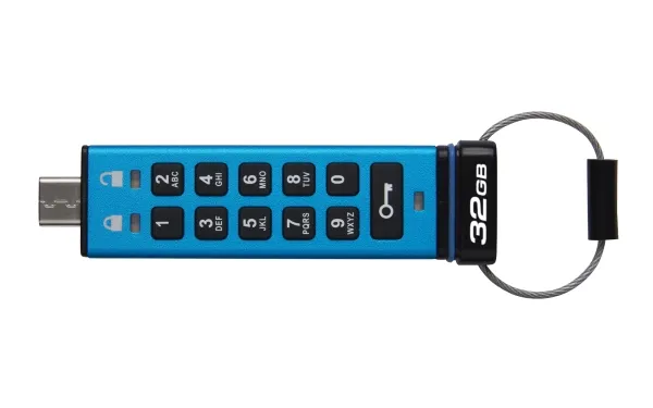 Built to withstand harsh environments, this flash drive is waterproof and dustproof with an IP57 rating. It is designed to function between 0°C and 50°C, making it reliable for various conditions. The Kingston IronKey Keypad 200C also includes advanced security measures such as brute-force protection and hardware encryption with a 256-bit AES-XTS algorithm. It features a key ring loop for transport, ensuring data is always within reach without compromising security.