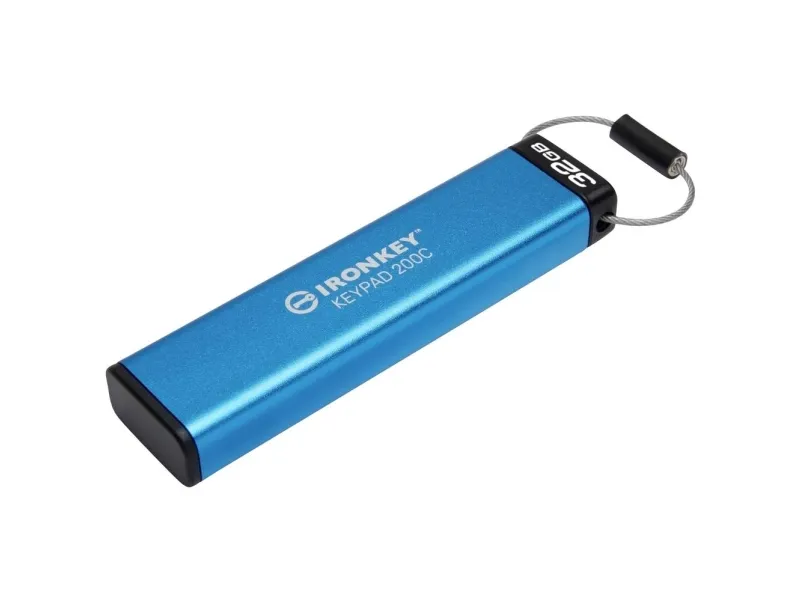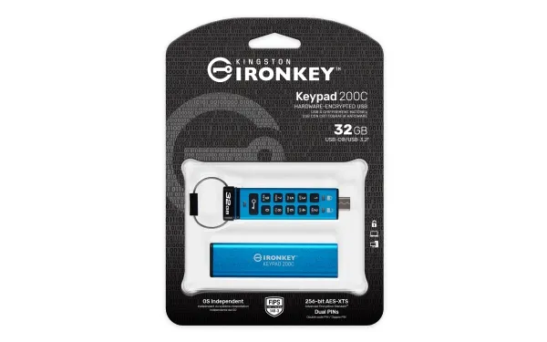 The Kingston IronKey Keypad 200C is a USB flash drive designed to meet rigorous security and durability standards. Featuring an onboard alphanumeric keypad, it provides easy access to data while ensuring robust password protection. The dual password feature adds an extra layer of security, allowing for both administrator and user access. With a storage capacity of 32 GB, it offers space for important files, enhanced by read speeds of 145 MB/s and write speeds of 115 MB/s.