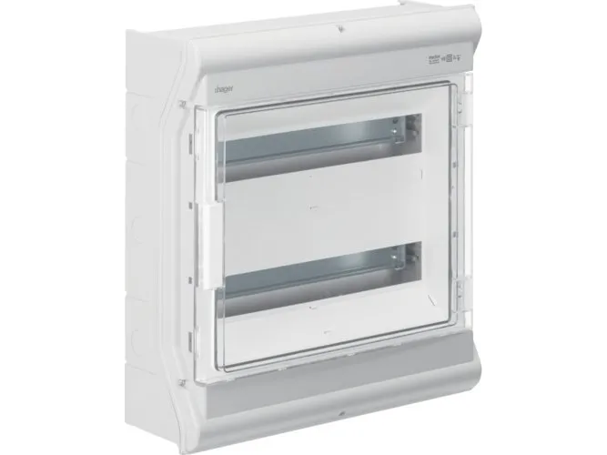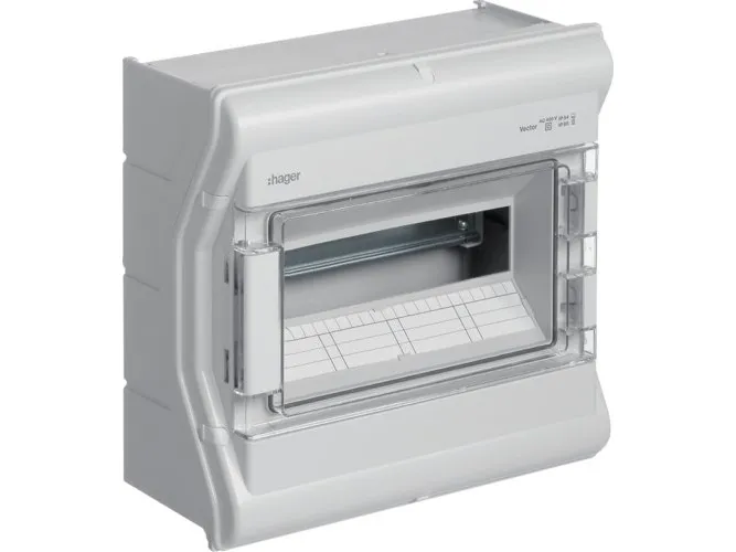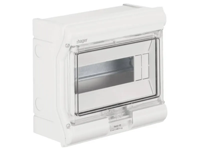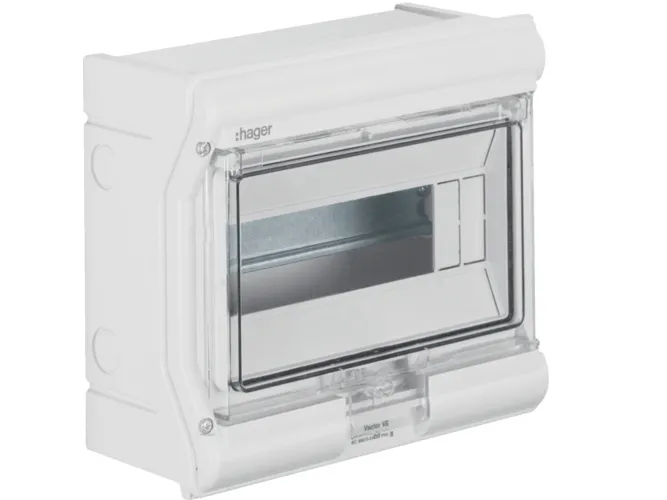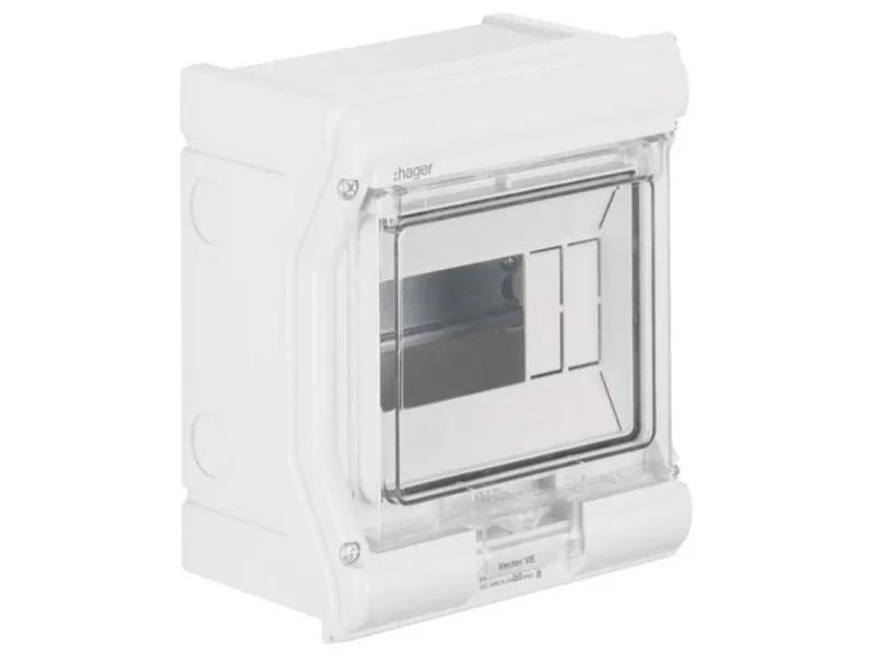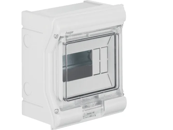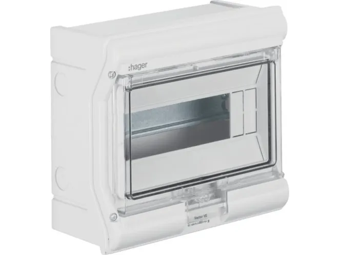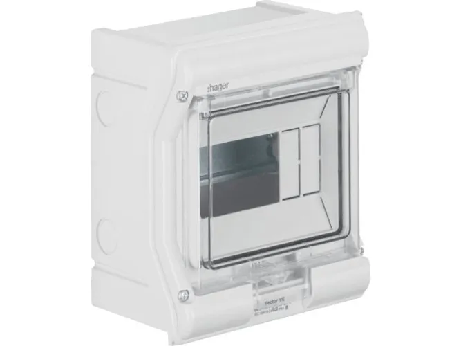 Hager VE106SN minifordeler vector APV IP65 6PLE UV stabil eller ledningsindf. Lille fordelingstavle, vector, APV, IP65, 6PLE, UV-stabil, uden ledningsindføring. Installationsfordeler af polycarbonat (UV-bestandig), iht. din en 60670-24, iht. din 43871. Til indbygning af enheder op til 63 A i henhold til målstandard din 43 880 med 70 mm eller 85 mm indbygningsdybde, mærkespænding AC 400 V/50 Hz. Består af plastikunderdel med din-profilskinne af forzinket stålplade, prægning til metriske ledningsføringstyller (oppe, nede), udformning på siden af forbindingstyller til at forbinde to eller flere fordelere ved siden af hinanden. Overdel med 46 mm åbning til apparatet. Transparent dør, som kan slås til i fronten, til højre eller venstre, kan plomberes, kan aflåses, fordeler kan påflanges.