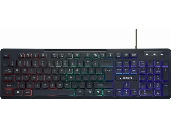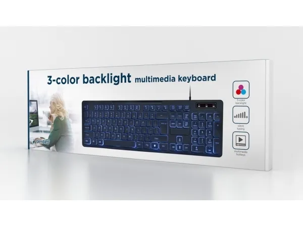 Discover the Gembird wired keyboard, a versatile and durable choice for any PC user. With its 3-color backlighting, it offers customizable illumination to suit your mood or environment. The keyboard features a robust design with a key life span of 10 million clicks, ensuring it can handle the demands of extensive use. It comes equipped with 12 multimedia buttons, providing easy access to essential functions without interrupting your workflow. The 1.45 m cable allows for flexible placement, while the 104 QWERTY layout with US localization caters to a wide range of typing needs. This keyboard meets compliance standards, including RoHS and EMC, making it a reliable and environmentally friendly option. Whether for gaming, work, or everyday use, the Gembird keyboard enhances your computing experience with its blend of functionality and style.