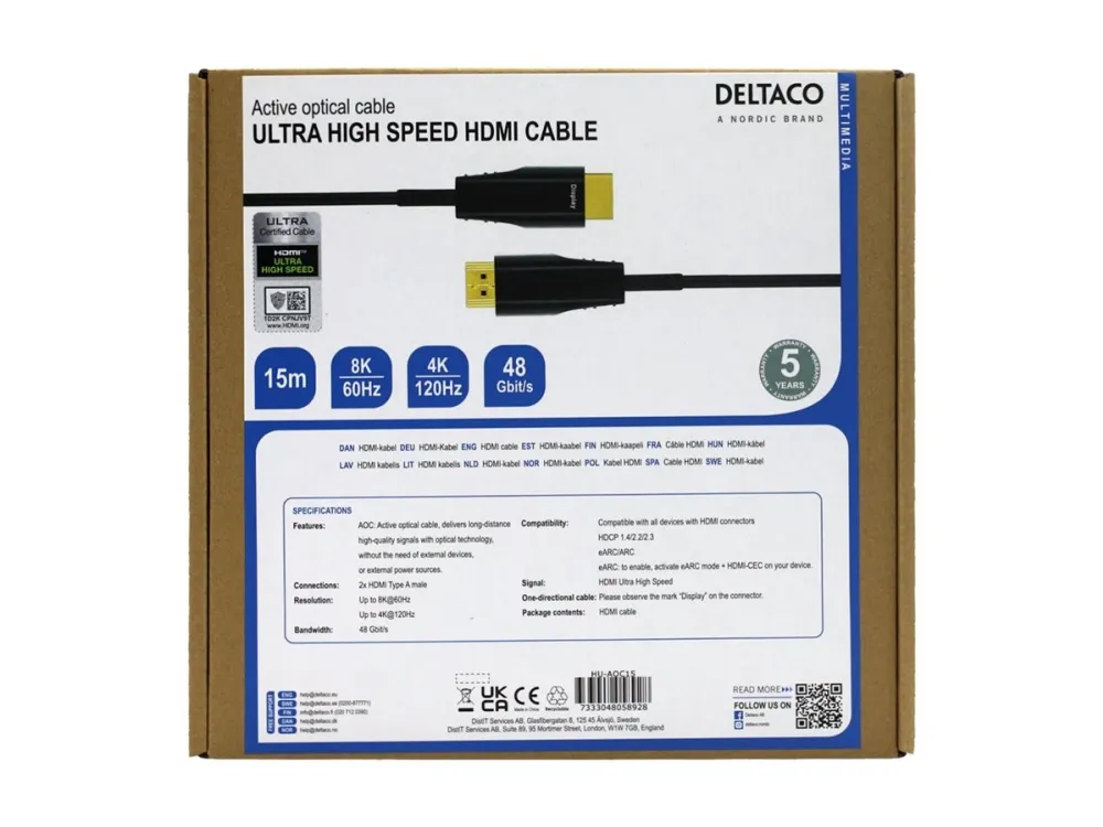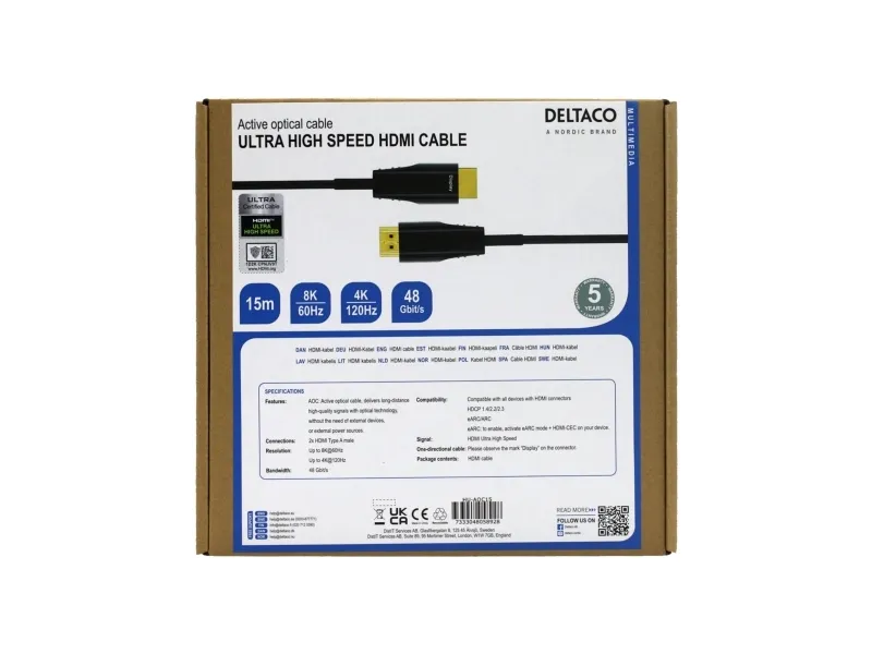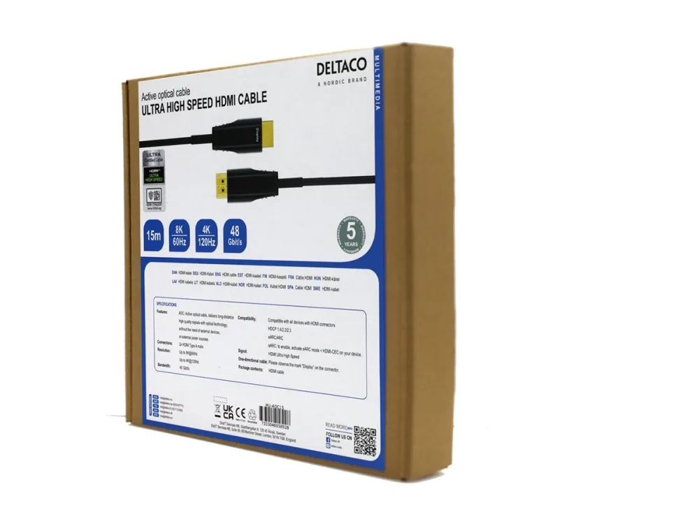 DELTACO Active Optical Cable tilbyr ytelse og allsidighet for HD-lyd- og videooverføring. Med støtte for oppløsninger på opptil 4K 60 Hz og en dataoverføringshastighet på opptil 48 Gbps sørger denne HDMI-kabelen for skarpe bilder og jevn avspilling, noe som gjør den egnet for både hjemmebruk og profesjonell bruk. Kabelen har gullbelagte kontakter som forbedrer ledningsevnen og holdbarheten, og er utformet for å gi en pålitelig tilkobling til enhetene dine, noe som sikrer et sterkt signal uten forringelse over lange avstander.