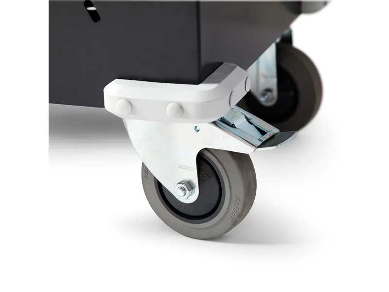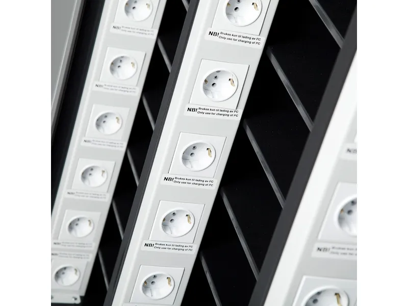 PC-skab med 10 rum. Dimension (h x b x d) 1250 x 530 x 500 mm.Praktiske mobile vogne/skabe for opbevaring og ladning af laptops og mobiltelefoner. Skabet har en solid konstruktion, to låsbare døre og en solid cylinderlås. Store letrullende, låsbare hjul og praktisk håndtag for enkel håndtering af vognen.Hvert rum har eget strømstik, tilkobling til EL sker med en fælles tilkobling til egen 16A sikring og overspændingsbeskyttelse. Denne model har sekventiel strømstyring til hvert rum, således at ikke alle ladestationer starter samtidig. Dette er for at varetage El-sikkerheden.Leveres som standard i miljørigtig pulverlakering, sort kabinet RAL 9005 og lys grå dør RAL 7035.