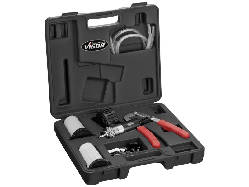 Vakuum- og trykpumpesæt 28 dele Ladetryk Undertryk-magnetventiler MAP-sensorer Tankluftninger Bremsedlednings-systemer Inklusiv omfattende adapter-sortiment Robust metaludførelse Trykdisplay-område 0 - 3 bar Undertryksdisplay-område 0 - 1 bar Maks. undertryk op til 0.7 bar Kontrol af tryk- og undertryksystemer.