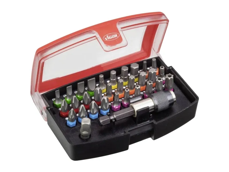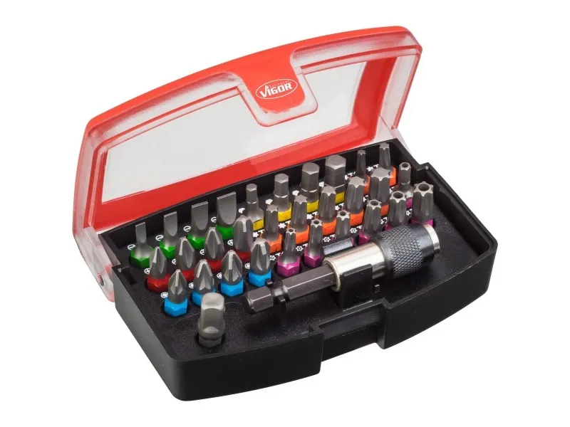 Vigor bit Box ∙ V5019 ∙ sekskant 6,3 (1/4 tommer) Skruetrækker-indsats (bit) ~ din / ISO T 10 H ∙ T 15 H ∙ T 20 H ∙ T 25 H ∙ T 27 H ∙ T 30 H ∙ T 40 H. T 10 ∙ T 15 ∙ T 20 ∙ T 25 ∙ T 27 ∙ T 30 ∙ T 40 PZ 1 (1x) ∙ PZ 2 (2x) ∙ PZ 3 (1x) PH 1 (1x) ∙ pH 2 (2x), pH 3 (1x) Indvendig sekskant 3 ∙ 4 ∙ 5 ∙ 6 mm Kærv 3 ∙ 4 ∙ 5 ∙ 6 mm Adapter V2452N