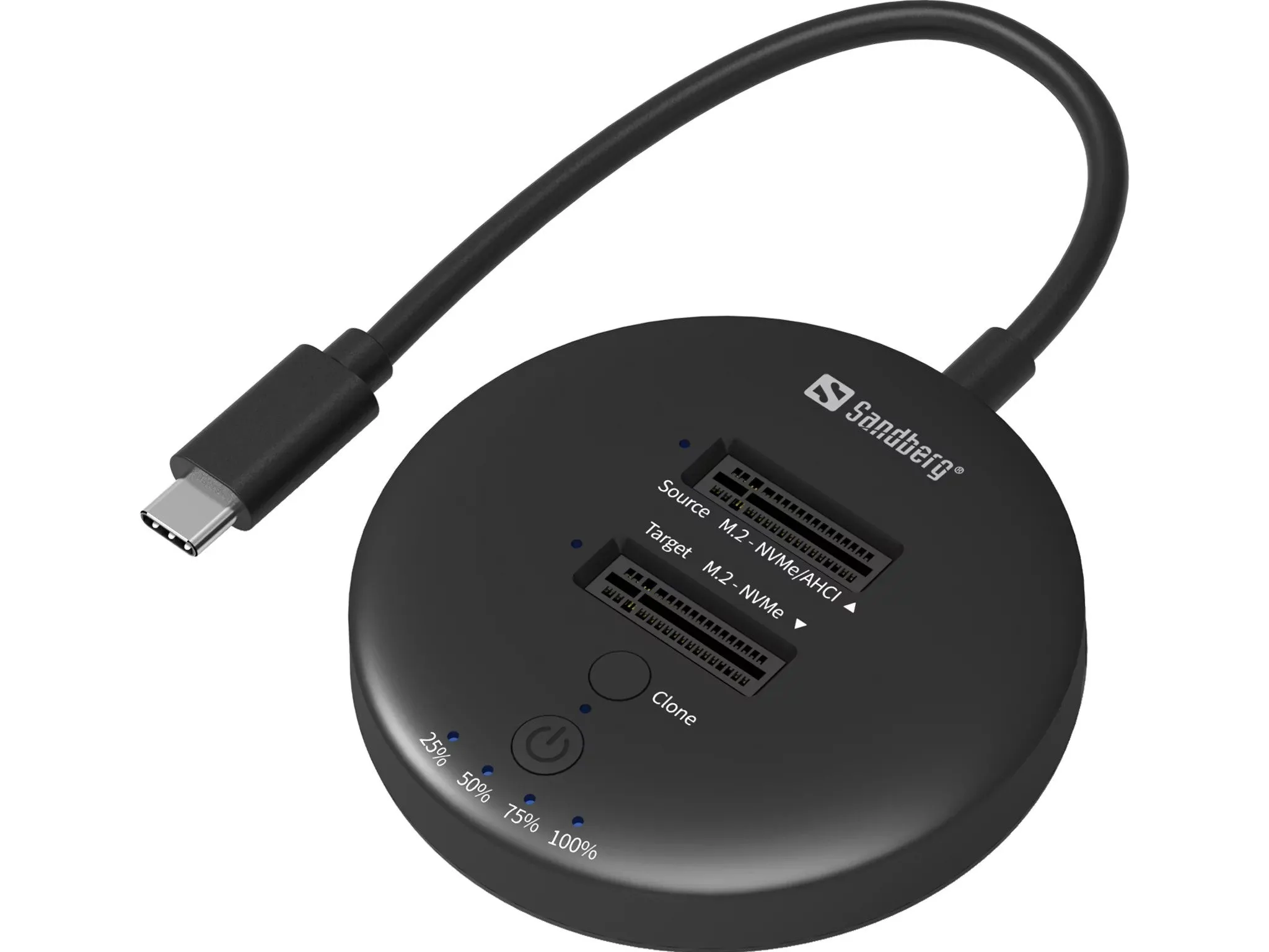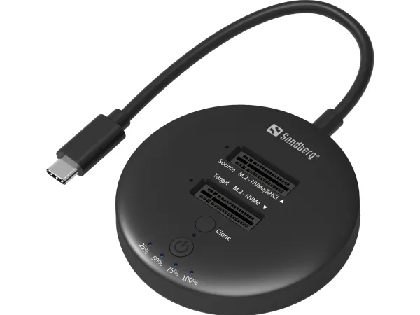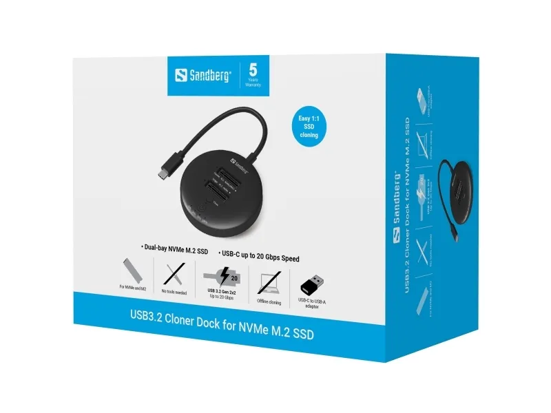 Sandberg USB3.2 Cloner Dock for M.2+NVMe gør det nemt at læse, skrive og klone dine NVMe SSD’er. Kloning fra en disk til en anden kan foretages helt uden tilslutning til en PC. Docken fungerer også perfekt som diskudvidelse, så du kan have to ekstra SSD’er tilsluttet din computer samtidig. Ideel til sikkerhedskopiering, dataoverførsel og udvidelse af lager. Understøtter op til 10 Gbps via USB-C og kræver hverken værktøj eller softwareinstallation.
