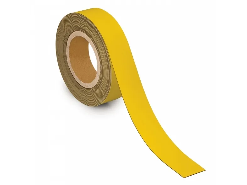 Magnetbånd med skrivbar overflade, gul, 4 cm Gør organiseringen enkel med dette praktiske og fleksible magnetbånd i gul fra MAUL. Det er den perfekte løsning til midlertidig (eller permanent) mærkning på metaloverflader – hvad enten det er på lageret, kontoret, i undervisningslokalet, køkkenet eller værkstedet. Magnetbåndet har en plastbelagt forside, som er nem at skrive på med whiteboardmarker eller tusch, og teksten kan let tørres af igen. Den magnetiske bagside sikrer, at båndet hæfter på alle metaloverflader, men det kan samtidig nemt flyttes og genplaceres uden at efterlade mærker. Det fungerer perfekt på stålreoler, metalskabe, køleskabe, magnetiske whiteboards og andre metalliske flader. Med en holdekraft på 42 g/cm² er du garanteret en stabil og holdbar fastgørelse. Båndet leveres på en praktisk rulle og kan nemt klippes til med en almindelig saks, så du hurtigt kan lave dine egne magnetiske labels i præcis den længde og form, du ønsker. Uanset om du bruger det som hyldeforkant eller til at skabe overblik i hjemmet, er dette magnetbånd en alsidig og professionel løsning. Bredde: 4 cm Længde: 10 m Tykkelse: 1 mm.