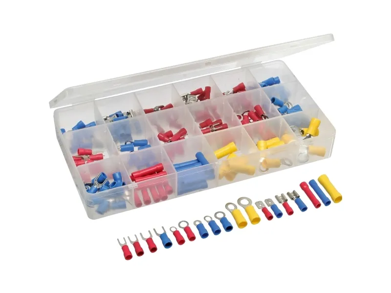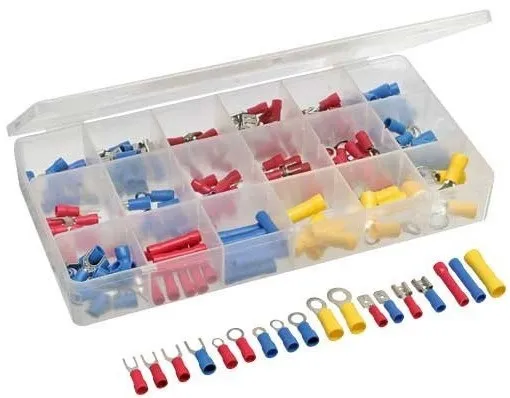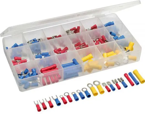 Cable shoe set with 200 pcs. Includes almost any cable shoe used in car electrics or in technical hobbies. Flat, ring, U-shaped or permaswage connectors in 3 different sizes.