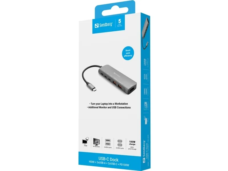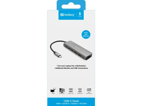 The Sandberg USB-C Docking Station offers a versatile solution for seamless connectivity and high-quality video output. This integrated docking station provides multiple interfaces, including HDMI output and USB-C with Power Delivery, making it suitable for personal and professional setups. Enjoy stunning visuals with a maximum resolution of 4K at a refresh rate of 60 Hz, ensuring that every detail is showcased with clarity. Constructed with durable aluminum housing, this docking station provides functional benefits and an elegant design. It supports mirror mode, allowing users to easily duplicate their displays. Compliant with multiple standards, including FCC, RoHS, WEEE, and UKCA, this product ensures reliable performance while meeting safety and environmental regulations. With the Sandberg USB-C Docking Station, expand connectivity options without compromising on quality or style.