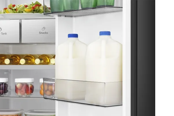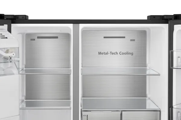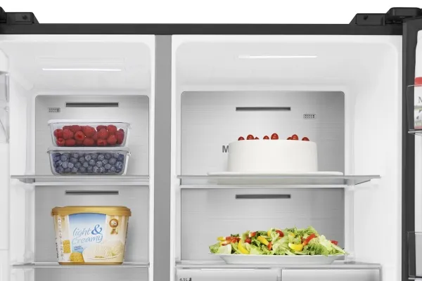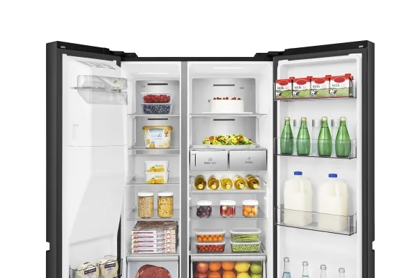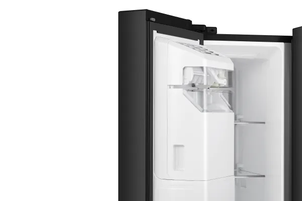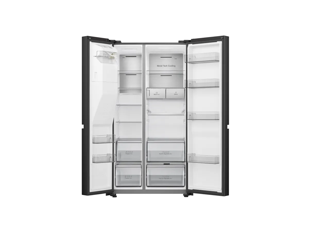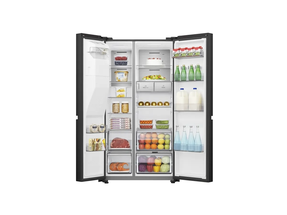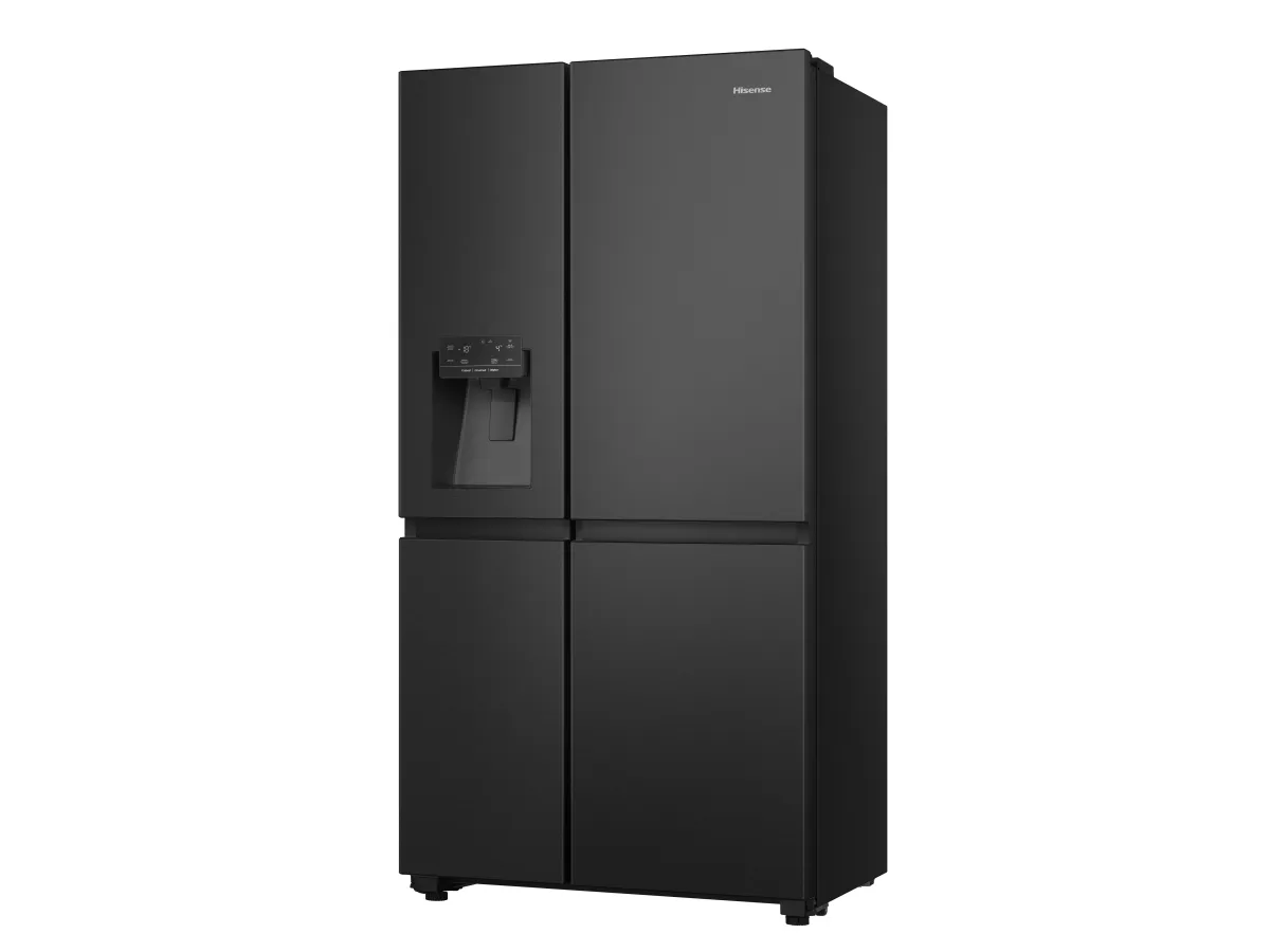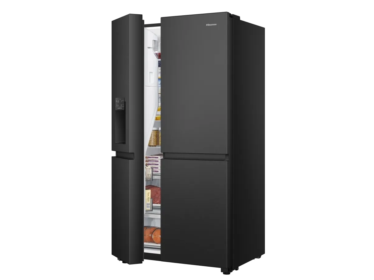 Enjoy plenty of space for stocking up on ingredients with this black stainless steel American fridge freezer from Hisense. Because it has a large 632 litre capacity, it can hold up to 35 bags of groceries. And it also comes with No Frost technology, circulating cool air inside the appliance to keep ice from forming, which means it doesn’t need manual defrosting. There’s a non-plumbed water and ice dispenser too, giving you refreshing drinks of H20 on tap – perfect for warmer days. Plus, the digital motor is whisper-quiet and uses less energy, so it’s great for your wallet and the environmentHisense Side by Side - RS818N4TFE ČR. Appliance placement: Freestanding, Product design: American door, Product colour: Black. Total net capacity: 632 L, Climate class: SN-T, Noise emission class: C. Fridge net capacity: 417 L, Lamp type: LED. Freezer net capacity: 215 L, Freezer position: Side-placed, Freezing capacity: 11 kg/24h. Cord length: 2 m