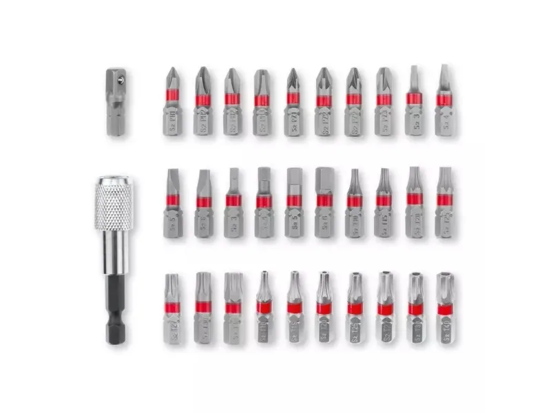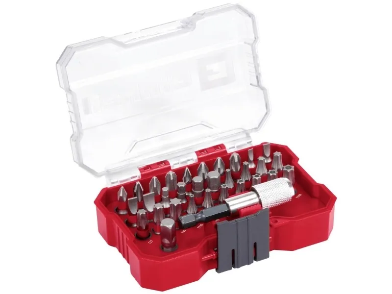 Einhell XS-Case 32-dele. Bit-sæt, 25-mm-bits, 60-mm-hurtigvekselbitholder, adapter med hex til 1/4 drev inkl. Opbevaringsboks XS-CASE fra Einhell tilbyder et ideelt grundudstyr til mange projekter og er kompatibel med alle gængse borepatroner og bitholdere i almindelige batteriskruemaskiner og boremaskiner. Bit-sættet indeholder 30 bits på 25 mm med C 6.3 skaft, der er forsynet med en rød farvering. HERUNDER ER DE SAMMENDREV PH1/PH2/PH2/PH3/PZ1/PZ2/PZ2/PZ3/SL3/SL3/SL4/SL5/SL6/H3 / H4 / H5 / H6 / T10 / T15 / T20 / T25 / T27 / T30 / T40 / TT10 / TT15 / TT20 / TT25 / TT27 / TT30 / TT40. Bits på Einhell sættet består af gråt sandblæst S2 stål, som er kendt for sin høje levetid og ydeevne. Ligeledes indeholdt i bit-sættet en 60 mm lang hurtigveksel-bitholder, som med sine stærke magneter sørger for en hurtig og nem bitskifte. E 6.3 skaft til bitholderen er fremstillet af modstandsdygtigt karbonstål. En anden central del af Einhell Einhell cases er adapteren med hex til 1/4 drev af robust, satineret CV-stål. Den praktiske opbevaringsboks i Einhell-design imponerer med et godt organiseret opbevaringsrum. Med den robuste Auto-Lock-clip-lukning opbevares værktøjssættet sikkert på stedet. Takket være det gennemsigtige låg er en optimal oversigt over de enkelte komponenter mulig. På denne måde kan du med et enkelt blik identificere indholdet uden at skulle åbne boksen. Den kompakte, men samtidig højtydende XS-Case giver et førsteklasses udvalg af værktøjer, med hvilke forskellige projekter kan gennemføres. Denne alsidighed gør det til et uundværligt bit-sæt til mange anvendelser hjemme, i haven og på værkstedet.