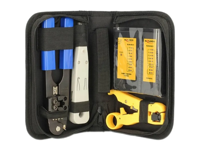 This toolkit by Delock includes all the tools to install network cables: a cable stripper, a crimping tool, a punch down tool and a network cable tester. In the handy bag the set is safe to carry and quick to deploy.