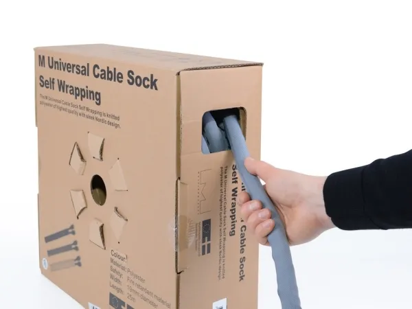 The M Universal Cable Sock Self Wrapping is knitted polyester of highest quality and with sleek nordic design. It holds any type of cables for example Scart, HDMI, CRT, VGA and other main leads and expands easily. It is perfect for easy hiding of your wiring at home or in the office.