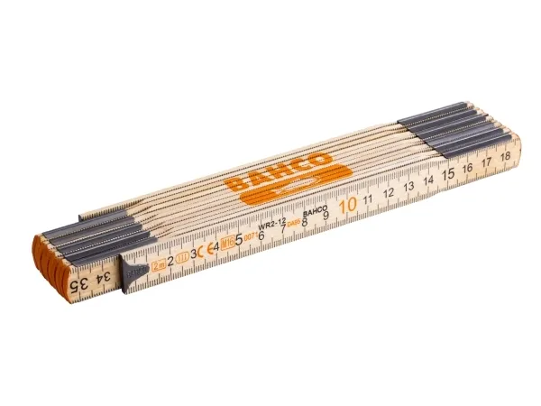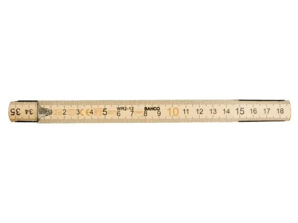 Tommestok fremstillet af birketræ. Led fremstillet af rustfast stål. Med 0-punkt i begge ender. EU klasse III. Længde 2 meter. Bredde 17 mm.
