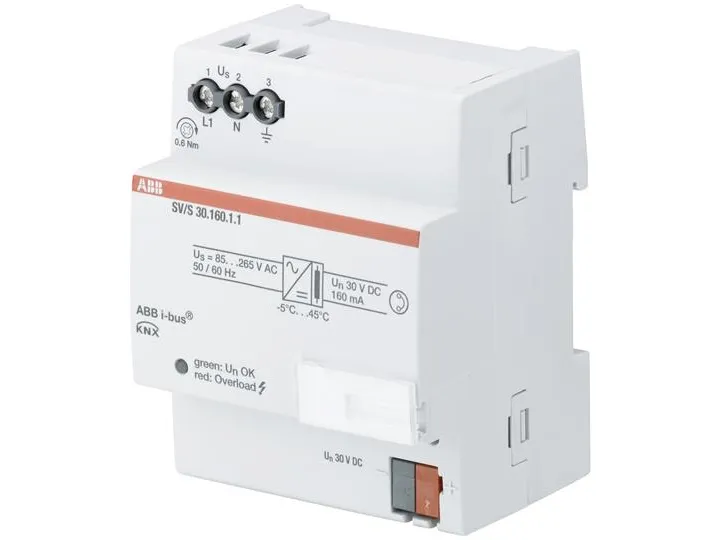 KNX power supplies 160 mA generate and monitor the KNX system voltage (SELV). The bus line is decoupled from the power supply by an integrated choke. The voltage output is short-circuit and overload protected. The two-color LED indicates device output status. With two-coloured status indicator and wide range input from 85…265 V AC, 50/60 Hz.