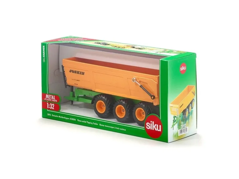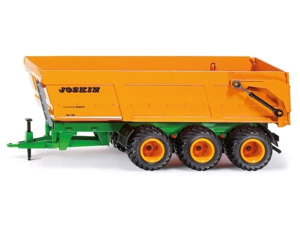 The mighty Joskin tipper trailer Trans-Space model is available in the largest edition. The 3-axle chassis is produced in die-cast metal and the powerful tyres have agricultural track. The tilting tipper with opening rear flap is made of sturdy plastic.