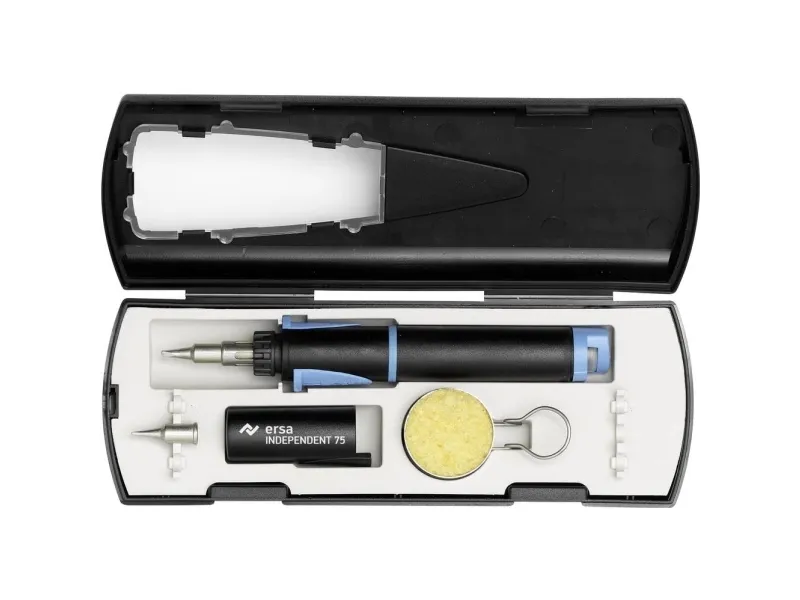 ERSA Independent 75 Basic Set Med piezotænding. Gasloddesæt med alsidige anvendelsesmuligheder, antistatisk, i praktisk plastiketui. Den ergonomiske gasloddekolbe gør det muligt at lodde uafhængigt af strøm overalt og til hver en tid. Med den trinløse, regulerbare ydelse (sammenlignet med elektriske loddekolber) kan der opnås maksimale loddespidstemperaturer på 580 °C. Maks. 75 W Med piezotænding