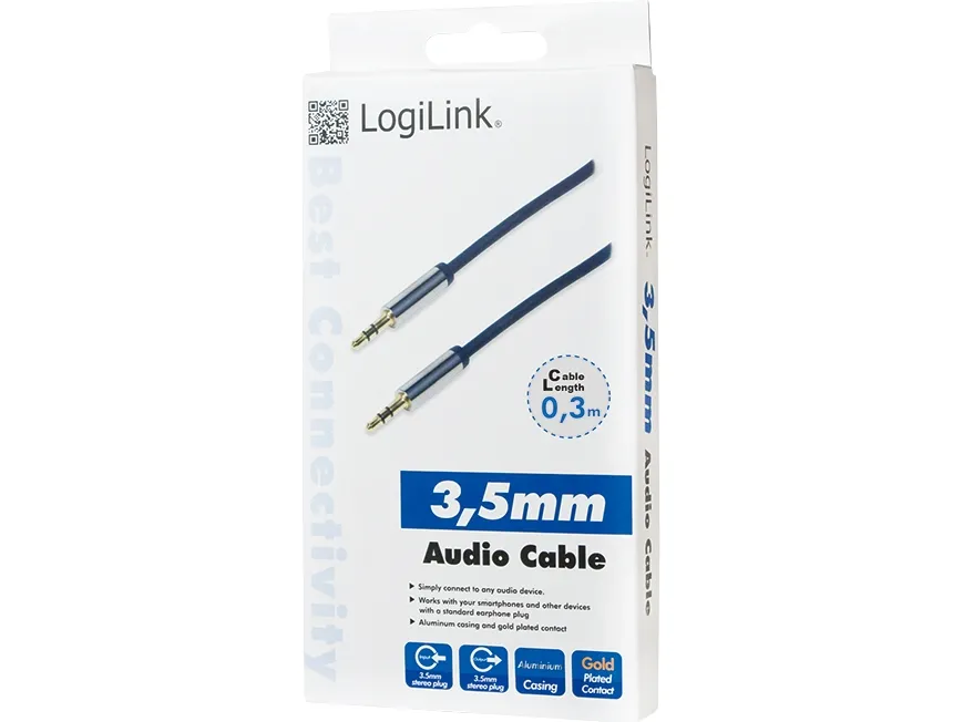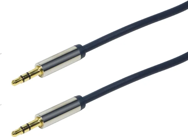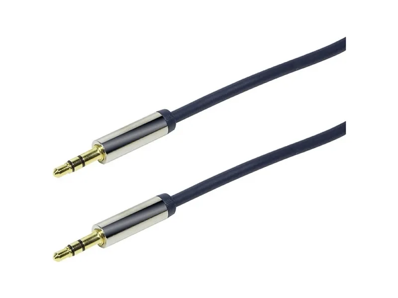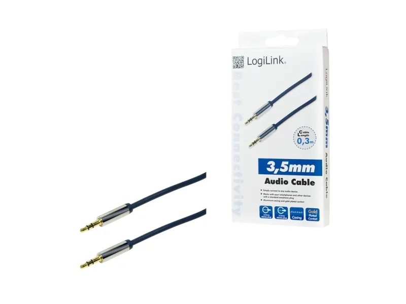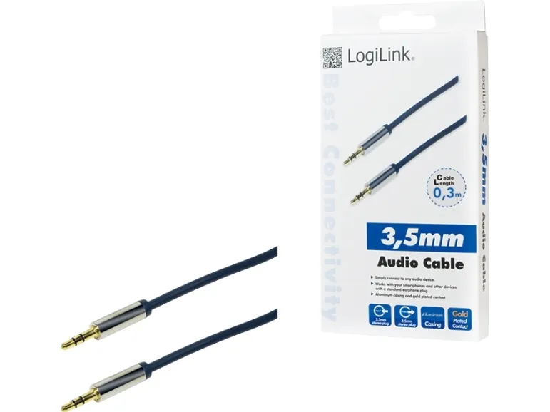 Listen to your favorite music or channel from your smartphone, tablet, laptop or TV on a proper hi-fi system with the LogiLink Audio Cable. You can easily connect your devices to the AUX-Connection of your car as well and start listening there while driving.\n- Gold plated pins, metal shell (copper)\n- Flexible slim PVC jacket, OD 3.7 mm\n- High quality copper conductor\n- Dark blue cable with metal jacket